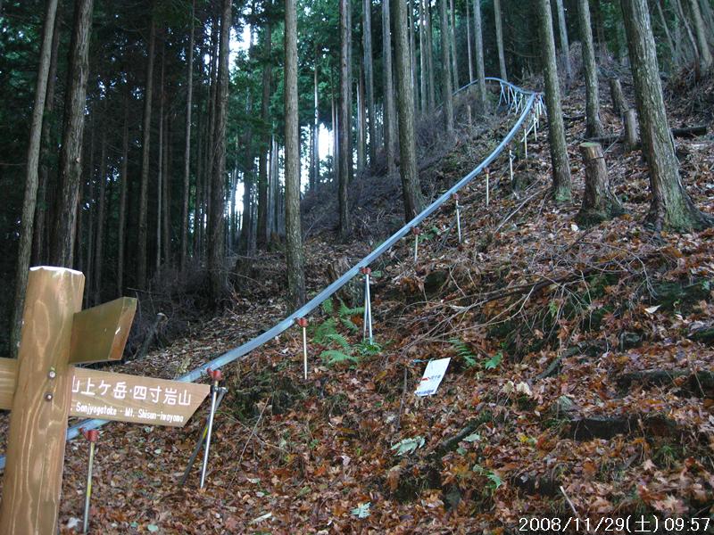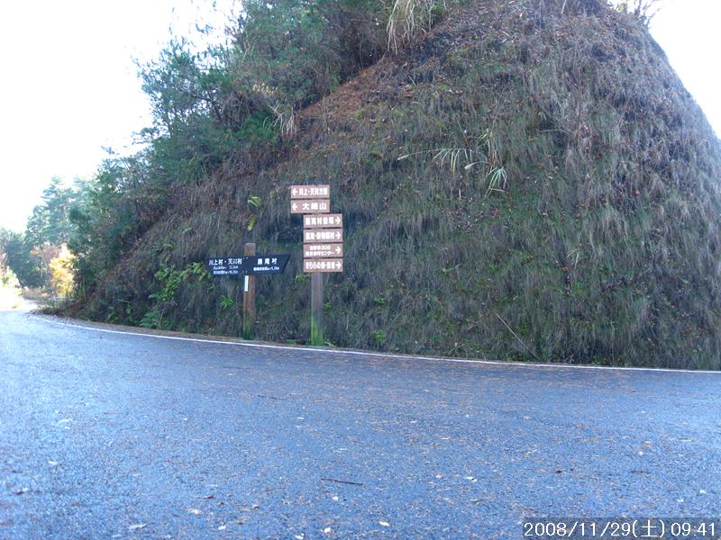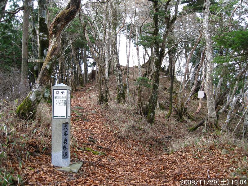 | 少し遅めの出発、いつもの事ながら前日に準備しておけばよいものを当日の朝に準備したため出発が遅くなる 以前に五番関から四寸岩山・大天井ヶ岳をめざした事があるが、時間の都合で大天井ヶ岳に行けなかったので、今回は吉野方面より四寸岩山経由で大天井ヶ岳へピストンする事とした。 奥駆道なので道ははっきりしていると思われるが位置の確認の意味でも1/25000地図をコピーするのに朝バタバタしてやったため少し時間をとられた スタート地点は青根ヶ峰近くとしカーナビに設定、表示は55㎞9:10頃着と出たが、実際の結果は58㎞ 9:10着であった。吉野でカーナビの案内が違うルートを指し少し大回りをしたが、吉野は何回か来たことがあり、地理感があったので自分の感を頼りに走った、結果は大正解 予定通り青根ヶ峰近くに路駐し出発、往きは出来るだけ古道を歩き、帰りは林道で戻る予定 青根ヶ峰より林道を少し行ったところで右に古道に入るが暫く歩くとまた林道に戻った、暫く林道をいくと今度は左側より四寸岩山への登山口が始まる。すぐに1102mのピークまで250mの急坂を登り四寸岩山の手前でまた急な登りとなった。いきなり急な登りのため少しペースを間違い足の疲れが大きい、四寸岩山は今年10月に来たが今回は反対方面より登頂となった、今から目指す大天井ヶ岳が見えるが相当遠くに見える、時間内にいけるか少し心配だ! 百丁茶屋跡への下りで、前回来たときに粘土状の道で滑りやすい急坂があったのを覚えていたが、今回は落ち葉があり大丈夫と思っていたら大間違い、ヅルッと滑り尻餅をついたので、咄嗟に両腕で支えたが50肩を患っている左肩に激痛が走る、暫く痛みで動けずそのままでいたらズボンに水がしみこんできた、落ち葉の下はぬかるみだった、ここは前回良く滑った所と気をつけていただけに大ドジを踏んだ 百丁茶屋跡に11:37到着、ガイド本では大天井ヶ岳まで1時間半くらいとあったので、頂上到着は1時くらいになるか、帰りは林道で行けば道に迷う事はなくたとえ暗くなっても電灯は持っているので問題なし 腹が減ってきたが頂上で食べる為ガマン 急坂を青息吐息で登り山頂到着、一息二息つきながら登ったが意外と早く1時間で登れた、もう足は限界に近い山頂はほとんど展望はなし、誰もいない山頂で空腹のため真っ先に定番のコンビニ食をいただく何もないのでデジカメだけを撮り下山開始 帰りは早い、林道出会いまで1時間弱、車で林道を走ったら分からなかったろうが見晴らせるところでは景色はよいので、後は林道をゆっくり歩いて戻った 今日一日誰とも会わず、こんな日に山歩きをする物好きはいない。 |