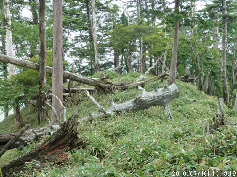 | 梅雨の真っ最中。今年の梅雨は雨が多い。天気予報では今日だけは梅雨の合間で晴れ/曇りの模様。 このところ運動不足で体が鈍っており、また湿気の多さで体調がイマイチであるが、久しぶりに山歩きに出かける。 ネットを見ていて、家からは少し遠いが、歩行距離が適当と思える七面山が目についた。今回はそこに。 本来なら歩き残している奥駈道の続きであるが、その続きの奥駈は長距離となるので、今の体力とこの暑さでは厳しいかと思い七面山とした。 以前に釈迦ヶ岳より見たときには、奥深い山であり当方には難しい山かなと思っていたが、五條市大塔町のホームページに登山口までの詳しい案内があった。また登山口からも適当な時間・距離であるので思ったより奥深いところでもない、早速地図を用意し行くことにした。 大塔町がホームページで案内しているほどでもあり、ルートはしっかりしており迷うようなところはなく、要所には案内板が整備してある。高度差は 1000m程度あるが初心者でも問題ない山である。危険場所もなく見た目とは全然違った山である。 しかし、尾根までは順調に問題なく来たが、山頂を目指し尾根歩きに入ったころから大汗をかき、西峰から東峰に登り返すころから体力的に一杯になってきた。 西峰にあった表示板には登山口まで85分となっているので駐車場所までは 2時間程度で戻れる。少し無理しても大丈夫であり、予定通り槍ノ尾ノ頭まで行き、アケボノ平で昼食を取り引き返すことに。 東峰よりの下りで今日初めて人と会う。単独さんで当方より若干若いようだ。旭の下の登山口から登り、釈迦ヶ岳経由で来たとのこと、今から槍ノ尾の尾根を下り大周回すること、驚異的な脚力だ。 |