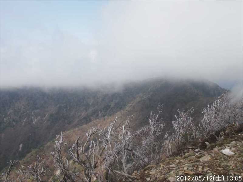 | 今年2回目の大峯へ 予定は、釈迦ヶ岳から、その先の孔雀岳、出来れば仏生ヶ嶽まで歩いてみたいと思っている この山は家から遠く、また長距離な山歩きとなるので、釈迦ヶ岳への最短の登山口、旭の太尾登山口から登る事にした。ここから登るのは今回で3回目である。 5年ぶりだ。 その太尾登山口へ行く林道(不動小屋谷林道)が、昨年9月に奈良南部を襲った「平成23年台風第12号」の影響で通行が可能か心配であったが、ネットで確認してみると問題なく登山口まで行けるようだ。 今日も朝早く起床、いつも通り目覚ましもなく予定通り 3時半に目が覚める。 朝早いせいもあるが寒い。昨日から、異常に冷え込んでいる。日本列島上空に寒気団が北から下りて来たためらしい。地表との温度差が40°以上あるため、その影響で関東の筑波では竜巻で大きな災害をもたらしているとの報道もあった。 一応冬用のズボンをはき、薄手のフリースとウインドブレーカーをザックに入れ出発。 途中いつもの24hスーパーで昼食の仕入れをしたが、定番のアルミ鍋うどんは販売してなく、夏用の割子うどんに入れ替わっていた、この寒さでは山の上では温かいものがほしくなると思うのでカップヌードルを購入。 R168は一部に迂回路があったものの、通行には支障なし。旭への分岐手前では大崩落があったが、新道とトンネルが開通しており全く問題なし。もし新道が開通していなければ、あの大崩落を見ると復旧には何年もかかったのではないかと思われた。 旭から不動小屋谷林道も復旧が出来ており、登山口まで乗用車でも問題なく通行出来た。帰路に通ると2~3か所でユンボが動いており工事していたが、通行には支障はなかった。 登山口に着くと、道路の左右にある駐車場所は、この早い時間でもほぼ埋まっており、ちょうど1台分の空きがあったのでそこに駐車。他にも路駐出来る場所も多くあるので特に問題はないが・・。 車から降りると寒い。 少し厚手のシャツを着ていたが、その上に持ってきたフリースとウインドブレーカーを着た。防寒着がほしいくらいだ。手袋なしでは済まされないが持参してきていなかったので軍手をはめる。 ガスがかかっており風も強い。昨日の天気予報では1日中晴れマークになっていたので、天候回復を期待して山歩き開始。 20分ほどで尾根に出ると、何と霧氷があるではないか。5月も半ばになるというのに想定外だ。 尾根歩きで高度を上げていくと、木についている霧氷もだんだん大きくなって来た。いつもは見える前方の釈迦ヶ岳や大日岳・深仙の宿はガスで全く見えない。 途中で親子3人ずれ(父・娘・息子)を追い越す、小学生くらいの子供さんと思われたが、この寒さで頑張って歩いていた。 順調に釈迦ヶ岳山頂に到着、一息ついただけで先に向かうが、孔雀岳方面への降り口を間違え真っすぐ行ってしまい、直ぐに山頂に引き返し、テープのあった所より下りなおす。最初から激下りで濡れた地面が滑りやすい。 激下りの後は、細尾根・岩稜地帯の連続で、気が抜けない。おまけに風が強いので、飛ばされることはないが風でバランスを崩さないように細心の注意で危険地帯を通過していく。 ガスで展望のないことにもよるが周りを見る余裕などははなかった。そんなこともあり地図にはいくつかの景勝地点があるが、何も分からず通過。「孔雀ノ覗」のみ表示板があったので気がついたが、ガスのため覗いても何も見えない。 孔雀山頂へは表示が見当たらなかったので巻き道を通り反対側に行く。この時点で帰りの釈迦ヶ岳への登り返しの事や、天候を考え仏生嶽へ行くのは断念する。 孔雀の巻き道は、一面の岩に苔が付いており、まるで日本庭園のような雰囲気の場所だ。但しその岩のためルートが分かりにくく歩きにくい。 その巻き道を孔雀の反対側にいき、登りやすそうなところから登り返す。山頂は表示板1個のみで展望もなし。 孔雀岳の山頂はそのまま通過し、縦走路まで戻り合流すると、孔雀ヶ岳への表示板があった。往きにこの表示板に気が付かなかったのは、表示板が上を向いていた為だ。キチンと元に戻しておいた。 帰りの細尾根・岩稜歩きでは往きよりも北風が強く、下の谷よりガスが吹け上がってくる。 尾根の南方面は時折ガスが流れ展望が開ける。天気のいい日に来たら、と思うと残念であるが、逆に次の機会の楽しみが増える、と前向きに(?)考える。 帰りには、仏生嶽をあきらめ時間に余裕ができたこともあり、ゆっくりと歩いたので往きには気が付かなかった像の鼻・蔵王権現も確認できた。 尾根から南の尾根下に下ったところで、風がないので、ここで昼食とする。 昼食中に健脚そうな単独の男性2人が続けて、釈迦の方角に通過していった。大きなザックではなかったので、仏生あたりまでのピストンか? 釈迦への登り返しも特に問題なく通過、但し往きに通っているはずの道がわかりにくかったところが2ヶ所ほどあった。山頂では4人の団体さんが1組ナ
