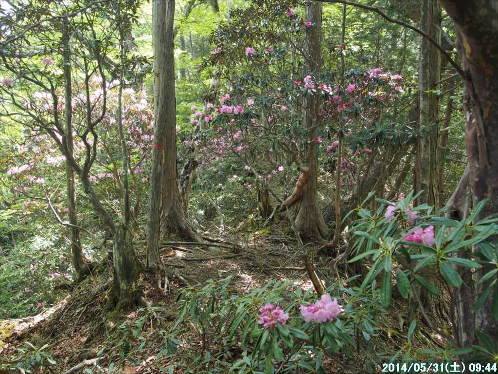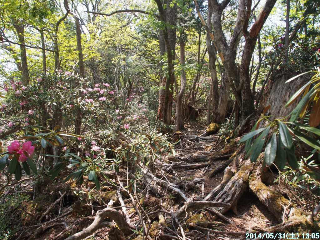 その先で伐採地を越えて、左の尾根に移動すると、その先は今が盛りのシャクナゲの花のトンネルロードが始まる。