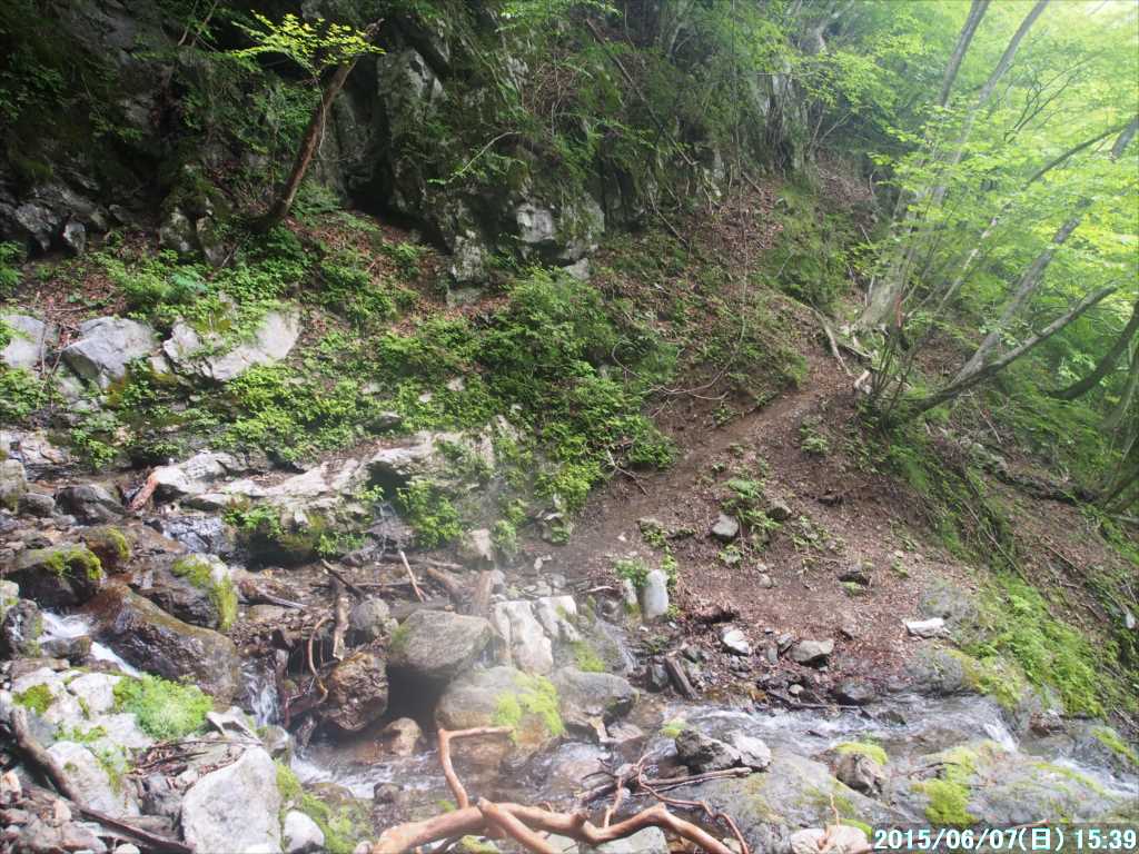 無双洞から水太谷林道への下りは、以前よりもルートが荒れていると感じた。特に川を高巻いて行くところは、道幅が狭く滑りやすくなっているので要注意だ。