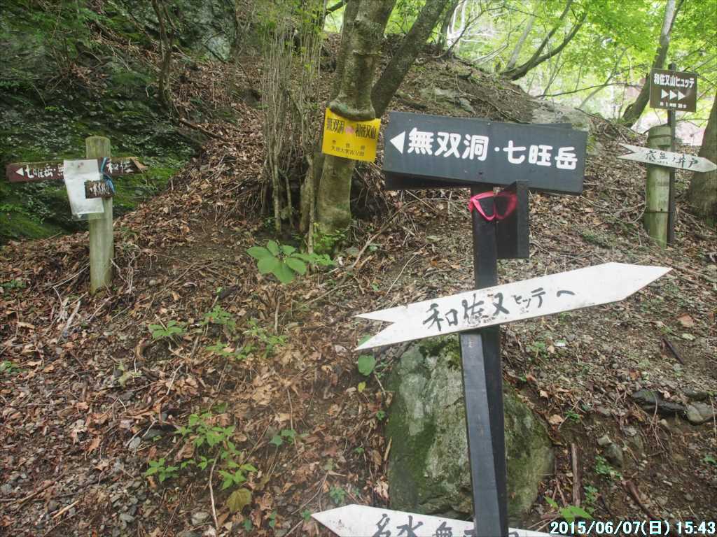 ここで、下山ルートを変更することにした。当初は弥山辻まで戻り謎の展望台から新田林道に下りるつもりであったが、昼食を取った後、最初のダメージから解放され元気が回復してきたので、七曜岳まで足を延ばし、無双洞へ下り、おいしい水をイッパイ飲み、水太谷林道から戻る予定とした。