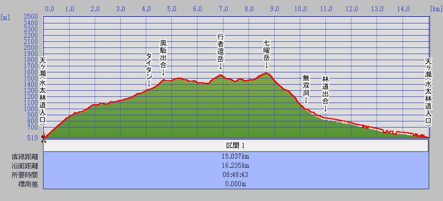 | 16:56 | ⑩ 天ヶ瀬(水太谷林道入口) | 総上昇量(GPS) | 1237 m | |||||||