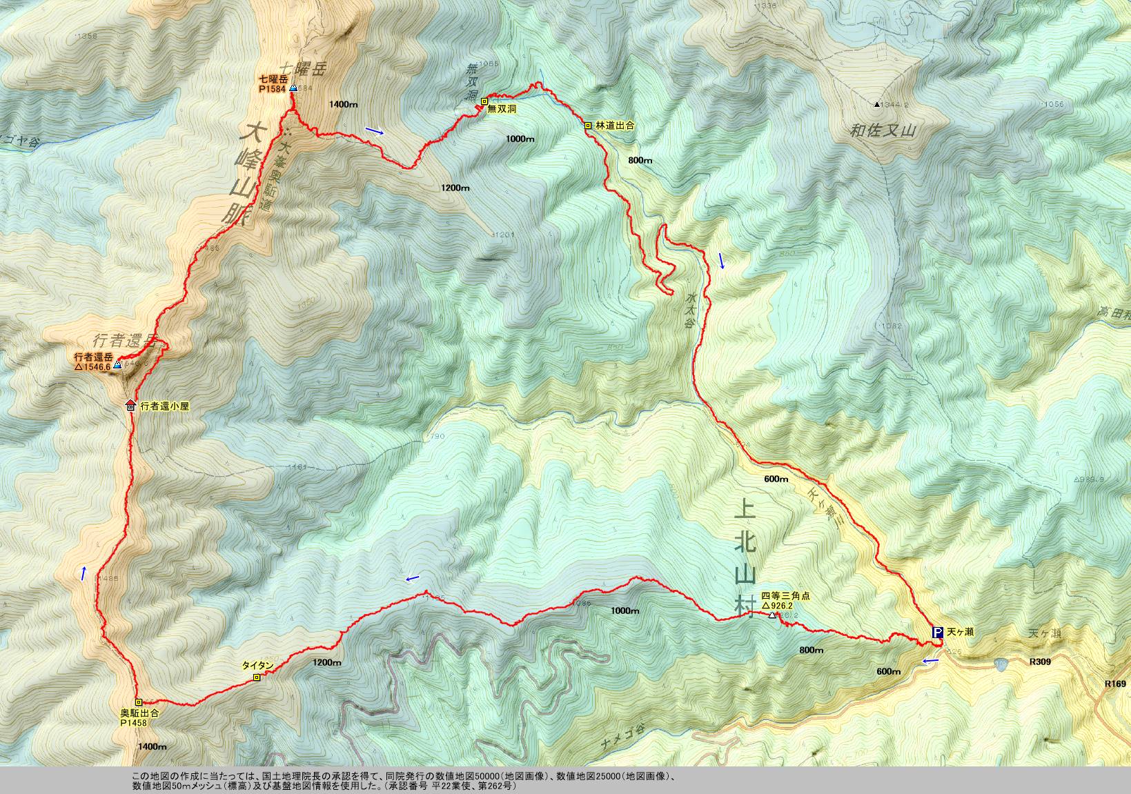 P → 《清明ノ尾》 → 奥駈出合(P1458) → 行者還小屋 → 行者還岳 → 七曜岳 → 無双洞 → 《水太谷林道》 → P