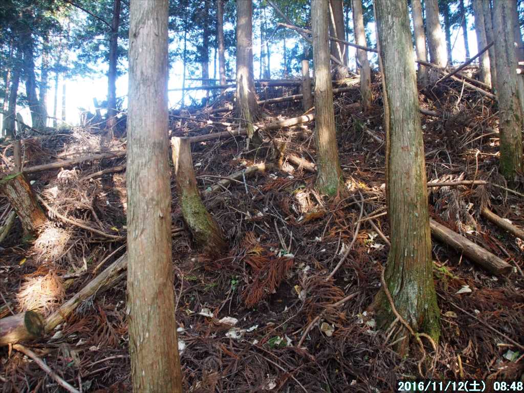 少し平行に進むと、テープの目印があり、左に折り返し登って行く分岐がある。その分岐に入り、それ以降、踏み跡らしき所を拾いながらジグザグに山の斜面を登って行く。紛らわしい獣道のような所もあり、道らしい所を選んで進むが、途中で完全に踏み跡を見失う。