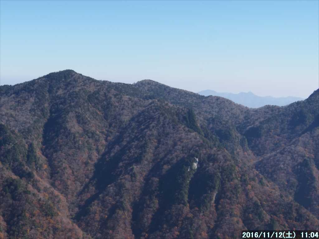 高度 970mの尾根に上がると、前方が開け、観音峯から三ツ塚への稜線が、青空とクッキリ分かれており、また山腹の紅葉と緑の植林とのコントラストもハッキリしていた。