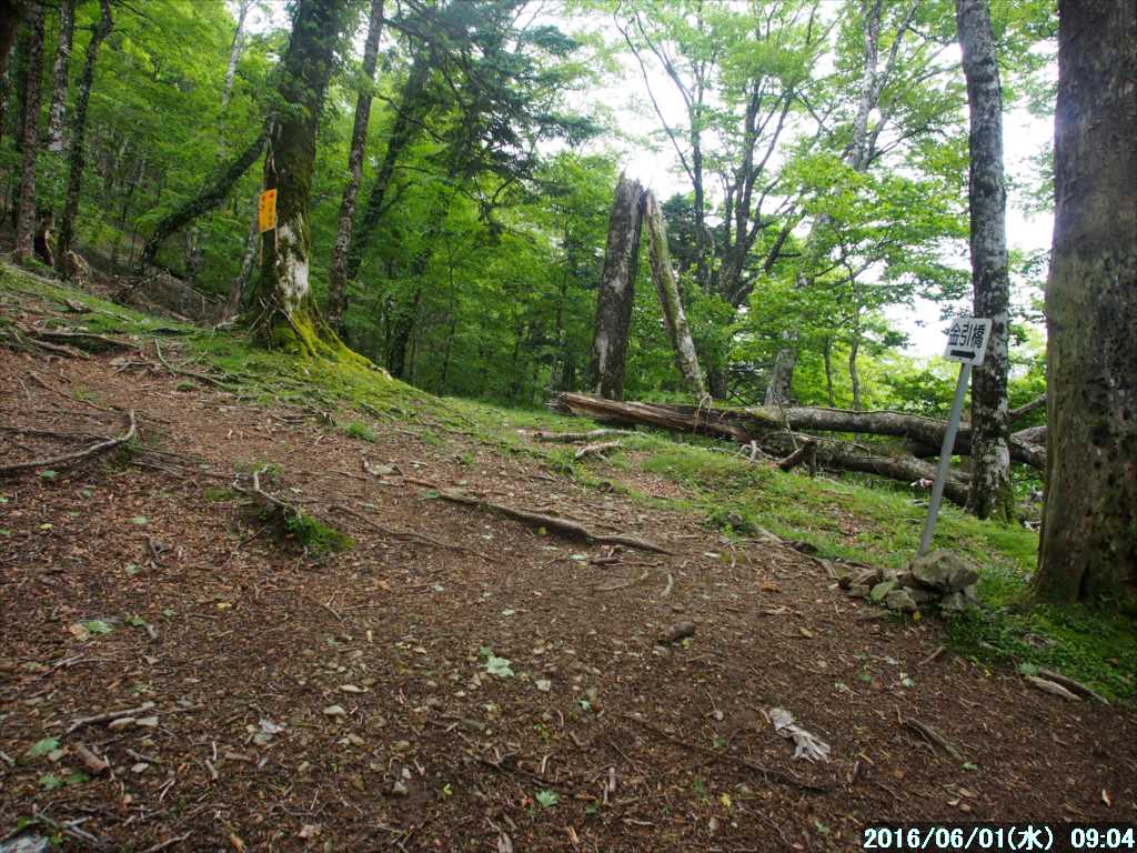 狼平避難小屋の中から話し声が聞こえたが、そのまま通過。高崎横手から頂仙岳を左から巻いて、あさ別れた河原小屋への分岐を右に見て一下りすると、金引橋への分岐だ。