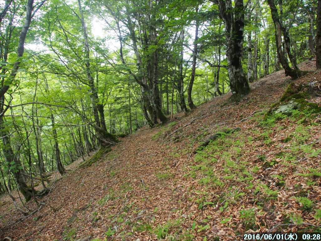 P1364を左から通過し、その先は傾斜がキツクなるが、激下りという程でもない。細尾根を下る所を注意しながら進むと、傾斜が緩くなりヌタ場のある広い所に出た。