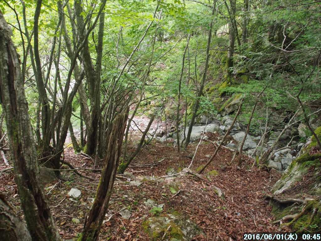 まだ崩壊していない古道?の部分を拾いつつ目的方向を確認しながら下ると、弥山川に繋がる支谷(「ナベの耳」からの谷)に出た。その谷から弥山川に降りる。