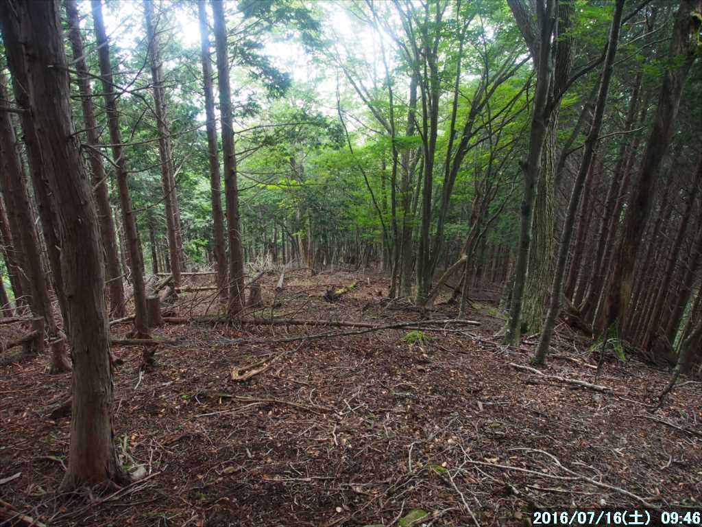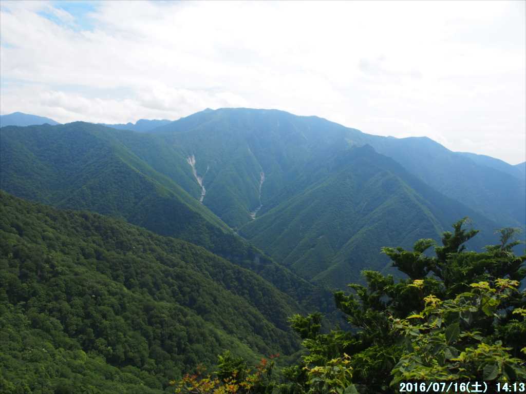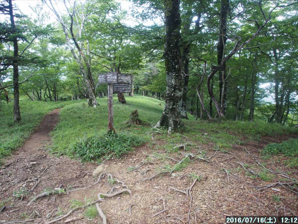 | 月曜日は「海の日」の祝日で今日から3連休(7/16~18)、年金生活の当方には関係ないが・・。 天気予報では連休初日の今日 10日のみが晴との事。 暑さと湿気が高いので、できるだけ標高の高い所から登りたい。と云う事で行者還りトンネルを起点に奥駈道を歩くことにした。トンネルの標高は 1100mある。 標高差も余りなく、歩く距離もそれほど長距離を考えていないので、普段起きる時間に起床。 それほど慌てずに自宅を出たら、途中で案外に通行量が多く、現地まで 2時間20分もかかってしまった。 有料になってから一度も停めたことがない、トンネル西口の駐車場を横に見て、トンネルを抜けると東口には車は 2台しか停まっていなかった。時間が遅くなったので駐車に苦労するかと心配していたが拍子抜けだ。 3連休の初日で天気も良い予報なのに、西口の駐車場の方もそれほど多く駐車していなかった。オオヤマレンゲのシーズンも終わって一服と云う所かな。 トンネル入り口横の「林道ナメゴ線」の起点より、その廃林道?に入る。 入って直ぐに、ナメゴ谷の源頭部を回り込んでいくが、以前あったと思われる駐車適地の広場は大きくその谷に崩れていた。 林道は荒れ放題で岩ゴロ道が多く、また土砂崩れで道が埋まっている所もあるが、歩くには支障がない。 50分程そんな林道を歩くと、小さな尾根先を回る所で、崩れた木の階段があった。高塚山から北に下りている 2重尾根の西側の尾根から派生している支尾根だ。 その支尾根と 2重尾根の西側の尾根との間の谷が大崩れしており、通過困難な所だ。 本来はその尾根先から登りたかったので、大崩れしている崩壊場所を横切ろうと踏み跡らしき所に少し足を踏み入れたが、余りにも危険すぎて引返す。 崩壊している上部から迂回出来そうな感じもしたが、足がすくんでしまい渡る気か萎えてしまったので、先ほどの木の階段の所から登ることにした。 林道からの取っ掛かりの 2~3mは、木の階段はほとんど崩れて登りにくかったが、すぐ上の樹林帯に入ると、朽ちてはいるが木の階段が残っているので歩きやすくなった。 傾斜が緩い所には階段がないので、踏み跡を拾いながらルートを外さないように登って行く。 木の階段がなくなると、間もなく左手からの主尾根に合流。目印やマーカーはないので、下りではこの分岐は分かりにくいので要注意だ。 合流した主尾根はそこそこ傾斜のあるものの障害物はないので、適当に歩きやすそうな所から上を目指す。 今日は蒸し暑そうだったので Tシャツ1枚でスタートしたが、案の定蒸し暑く、林道から 300m程度の登りしかなかったのに、汗ビッショリになってしまった。少し搾れば滴が落ちる位に濡れている。 高塚山の三角点にはドンピシャで突き上げた。山頂は少し風があり、ガスのせいかまだ気温が余り上がっておらず、濡れたTシャツで汗冷えして寒くなった。タオルで体の汗を拭い、濡れたTシャツもそのタオルでふく。 こんな経験は初めて、ジムで毎日のように汗を流しているので新陳代謝が良くなったのかな。 オニギリで小腹ごしらえをして、長袖の薄手のシャツを1枚上に着て高塚山をあとにする。 奥駈に向かう雰囲気の良い稜線上を歩く。ガスがかかっていて、少し神秘的な森の雰囲気だ。 小谷林道への分岐の少し手前で稜線上に岩稜が出てくるが、テープの指示に従い左(南)から巻く。 その分岐に到着し、先ほどから頭にちらつき始めた三本栂に往復することにした。 ダラダラと稜線を下って行き、少し登ると三本栂。5年前に1度訪れているが、静かな森の中で中々の雰囲気の良い所だ。 直ぐに引返し、先ほど軽快に下った坂をエッチラ・オッチラと登り返すと、先ほど別れた高塚山への分岐点だ、P1418のピークを踏んで、奥駈道に向かう。こちらの稜線も大変に雰囲気の良いブナの森だ。 登りに掛かり、ササ地帯が現れると間もなく奥駈道へ合流。 その奥駈道を少し下ると、トンネル東口に下る論所ノ尾への分岐点。そこから少し先が一ノ垰。以前にあった小屋は撤去されており、今は小さな空地が残っているのみだ。 暑くなってきた奥崖の稜線を歩いていると、しなの木出合の標識の前で単独さんが休憩していた。入山してから初めて見る人だ。 帰りに下山する予定の清明ノ尾分岐の P1458を過ぎて、30分程で行者還小屋に到着、小屋の横にテントが張ってあったが、人影は無く小屋の中も無人。 行者還小屋の中で遅くなった昼食。コーヒーを飲んだりゆっくりとしていたが、休憩中誰も訪れる事はなかった。 だいぶ疲れたがまだ時間があるので、行者還岳に往復してから下山することにする。 行者還岳の南側にある唯一の展望地から、午前中はガスがかかっていて見えなかった展望を今日初めて見て、その景色をスマホのパノラマモードで撮る。 なお、今までパノラマはコンデジで取っていたが、スマホにパノラマモードがあるのを最近知った。そのスマホの方がパノラマの接続が綺麗だ。 行者還小屋ま