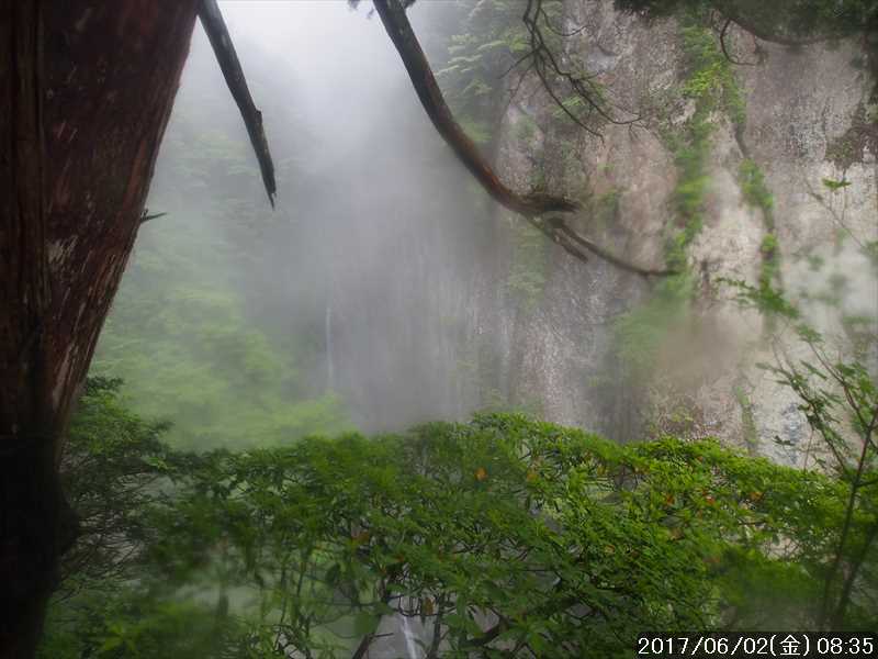 双門滝の展望地の「仙人嵓前のテラス」に着くと、ガスっていて双門滝はボンヤリとしか見えなかった。日本の名瀑100選の中では、見るのに一番困難な場所にあるそこまで来たのに残念だった。まぁー見えるだけまだましかな。
