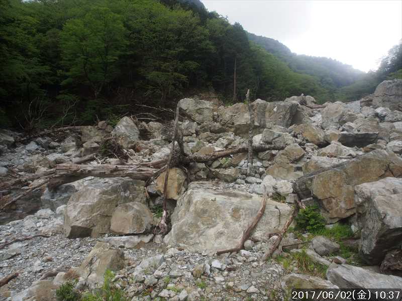 河原小屋を跡形なく崩壊させた大崩壊地を過ぎ、広い河原を通過すると、赤リボンを頼りに、左岸側・右岸側を高巻いたり、河原の大岩の中を歩けるところを探しながら通過したりする。