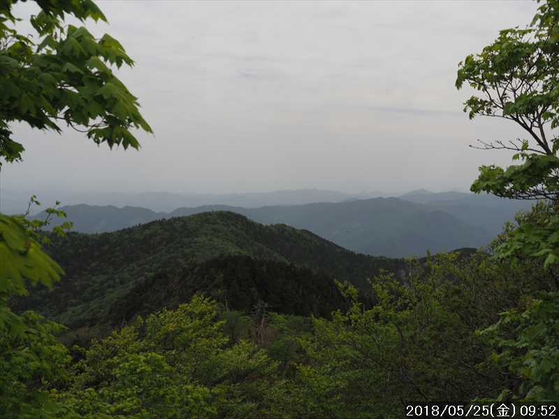 大普賢岳から急坂を下ると水太覗だ。下に光っているのが見えたので、ズームで確認すると、水太谷林道に停まっている白いワンボックスカーのように見えた。
