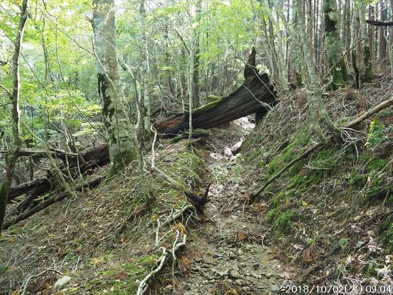 山の斜面上を横切って行くルートなので、谷を巻いて行く場面はどうしても荒れており注意を要した。特に 1ヶ所、ほぼ道が崩壊し、滑りやすい砂地模様の谷筋を巻いて行く所では肝を冷やしながら通過した。帰路でそこを再び通過するのはゼッタイに嫌だったので、帰路は旧道の尾根道から戻る事にした。