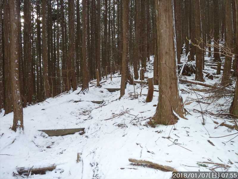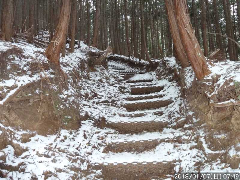 尾根を別れる手前の急下りを超えた所でアイゼンを外す。蛇篭階段、その下の丸太階段を滑らないように下る。