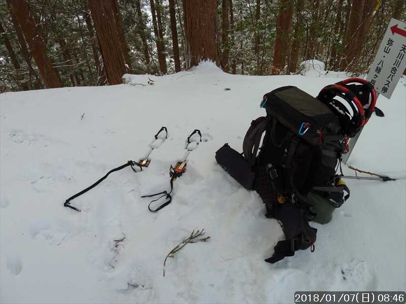 その林道を少し入った所で、アイゼンからスノーシューに履き替える。その作業中単独さんが追い抜いて行った。