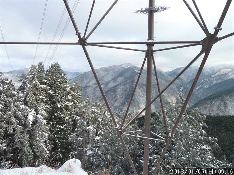 高度 820m付近にある鉄塔台地に上がると、空が開け東方面に展望があるが、曇り空で近くの観音峯山は見えるが、稲村ヶ岳は雲がかかって見えない。今日の天気予報は晴なので、奥深い山は天候の回復が遅れているのかな。目的地に着く頃に青空が覗いてくれれば良いのだか。