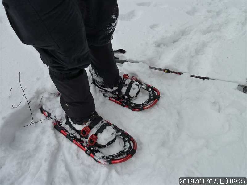 栃尾辻への急下りで、スノーシューが滑りまくりだった。勢いよくハデにもコケた。平地用の廉価品のスノーシューでは急な下りはムリだ。山用のスノーシューがほしい。
