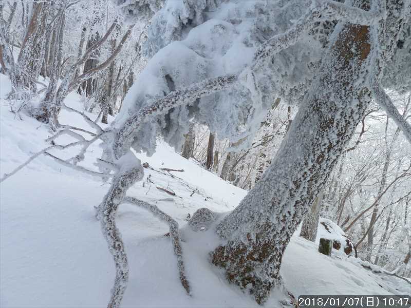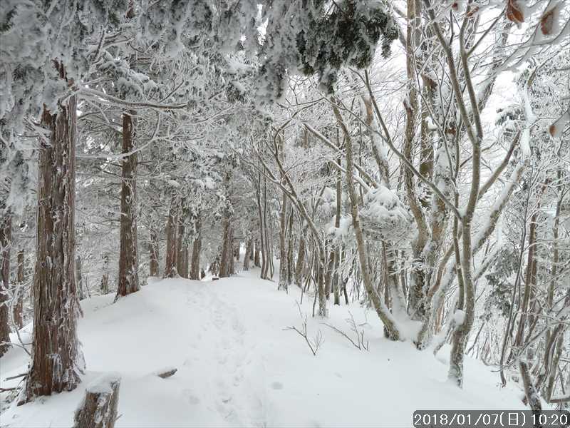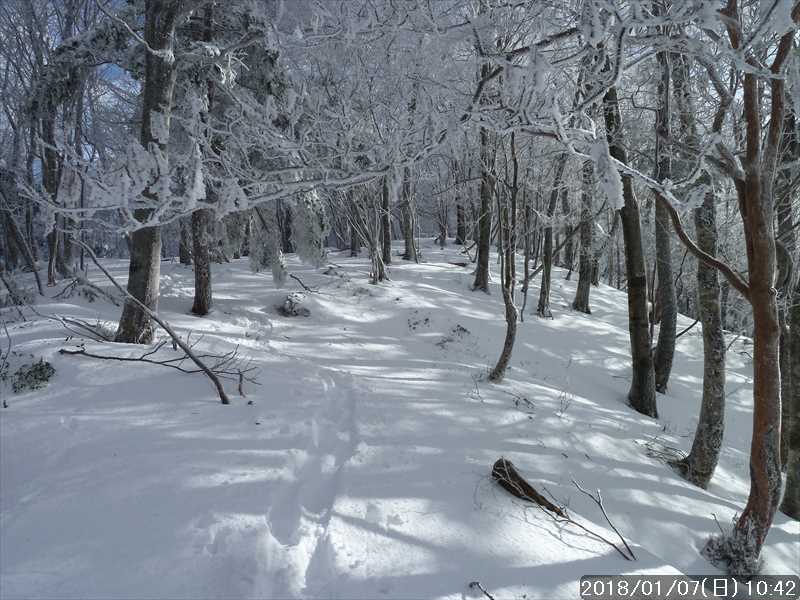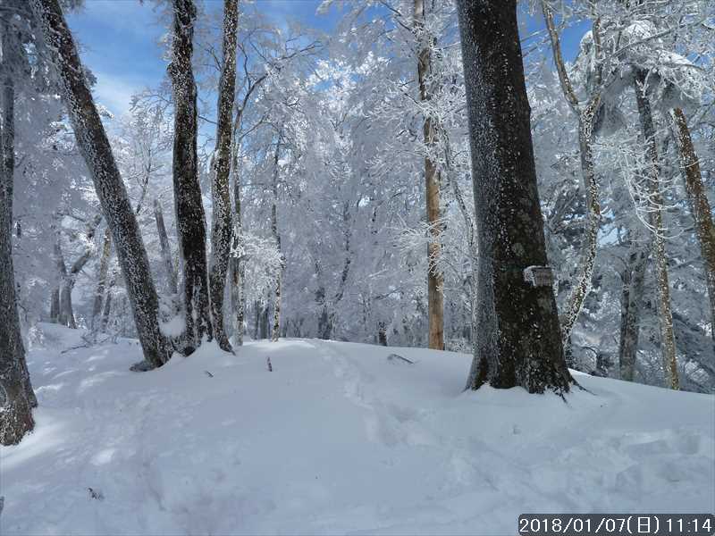 林道を別れ山道に入る所で、その単独さんに先行して山道を進む。周りの樹々には霧氷の花が咲いている。トレースがあるのでコース取りの心配がないので鑑賞しながらすすむ。