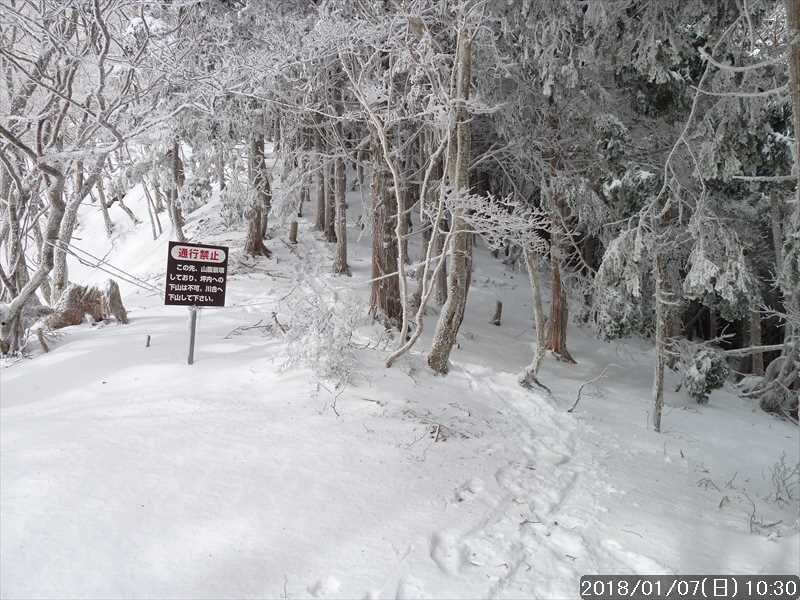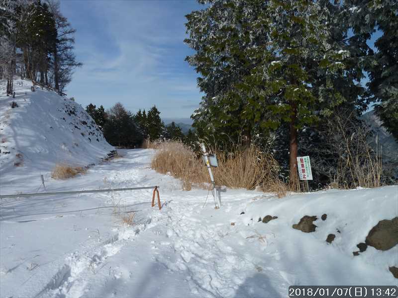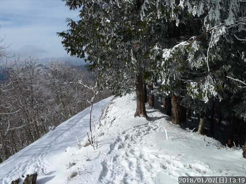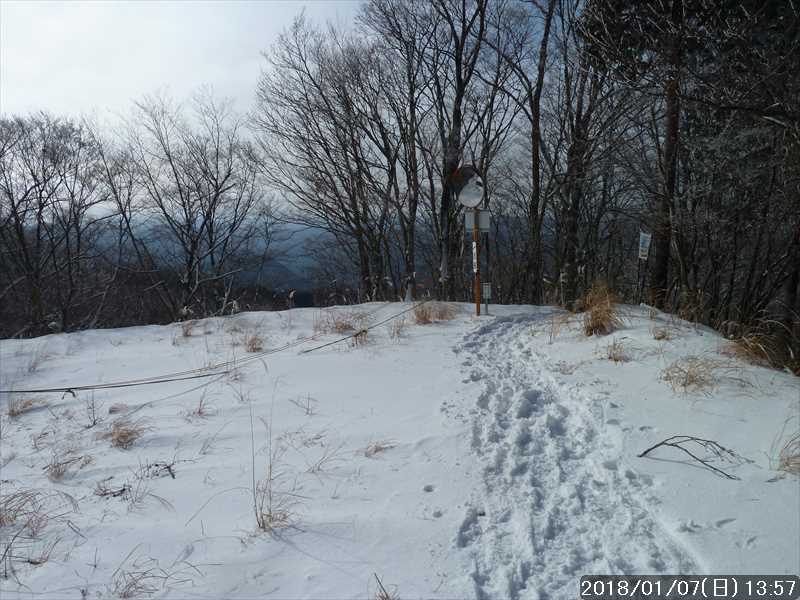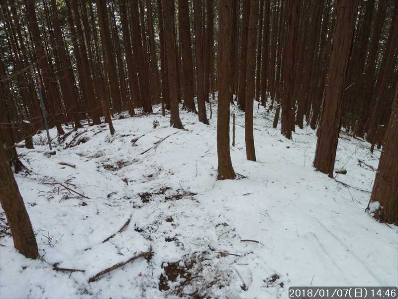 坪内林道に上がり、ヘアピンカーブを巻いて行くと、尾根道を行く登山道と林道の両方にトレースがあった。登山道の方は先行して行ったペアさんの模様で、林道の方は 1人分の足跡だった。