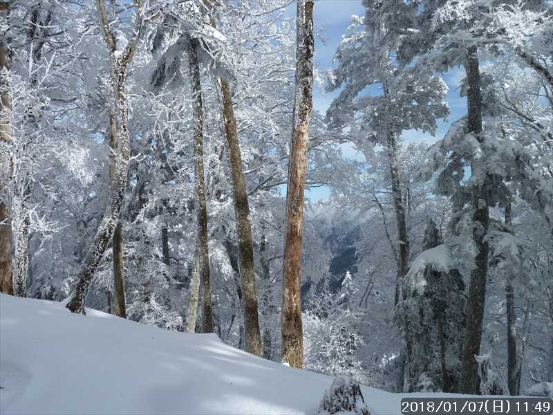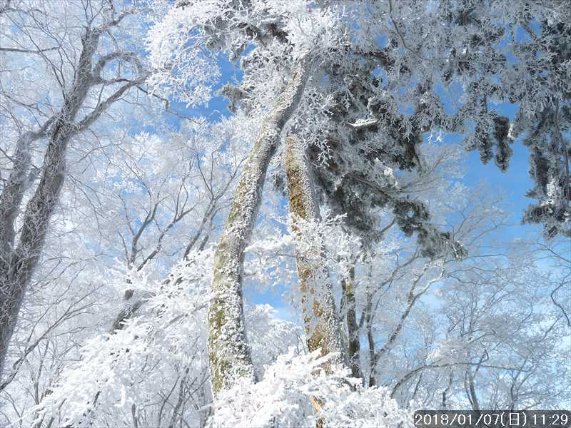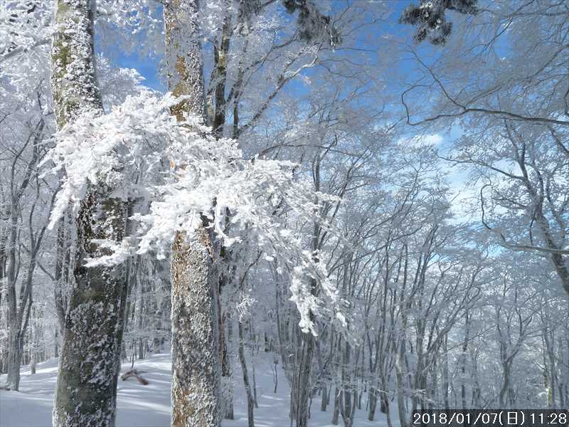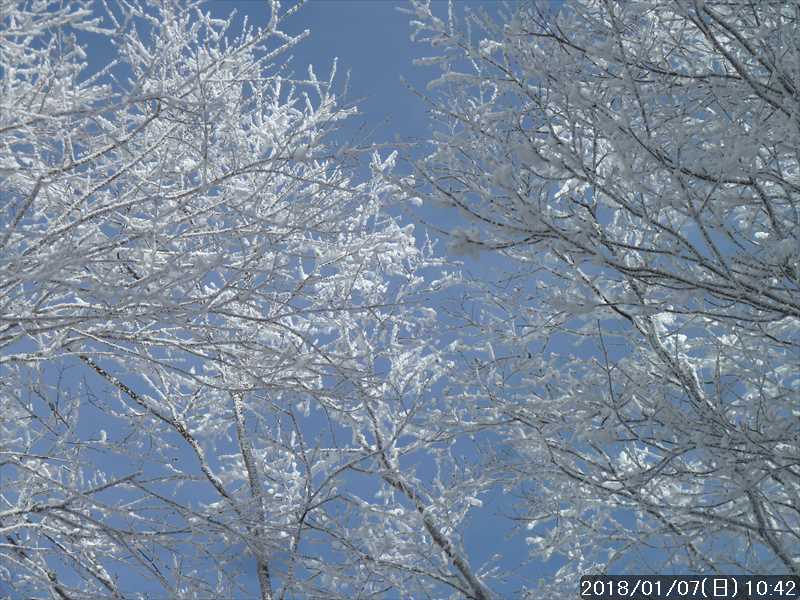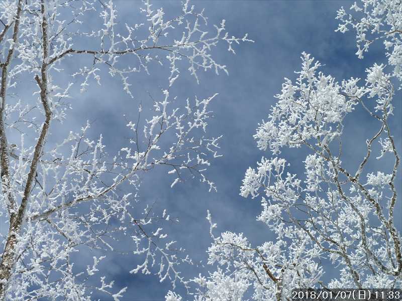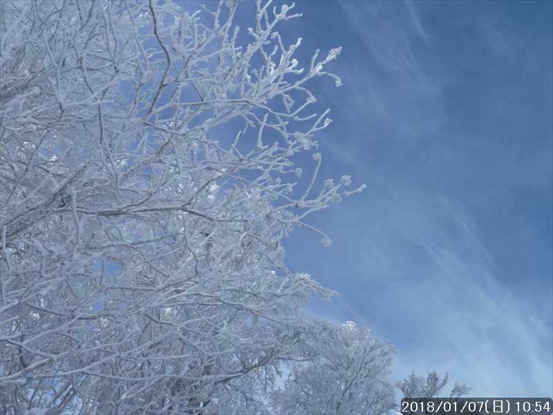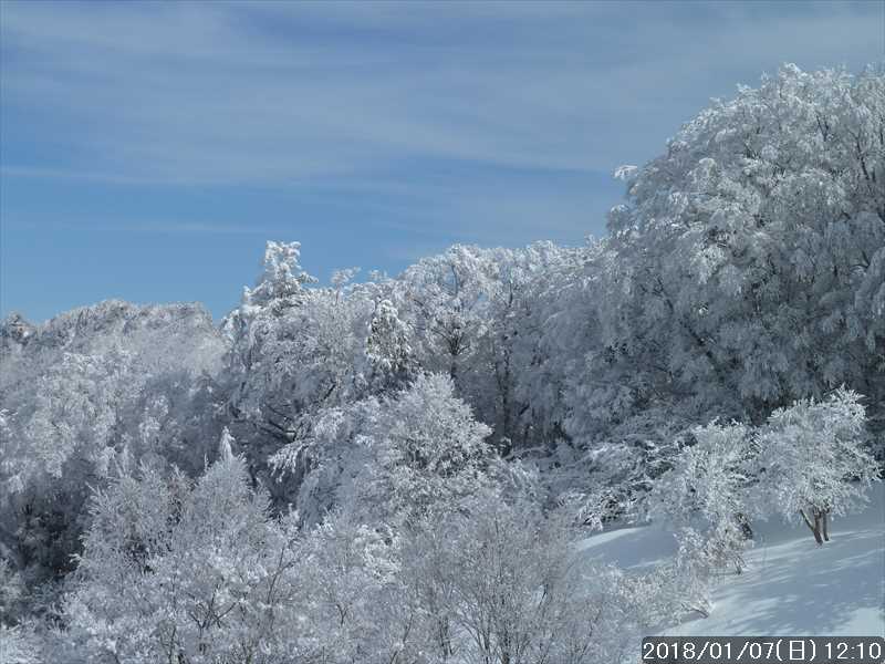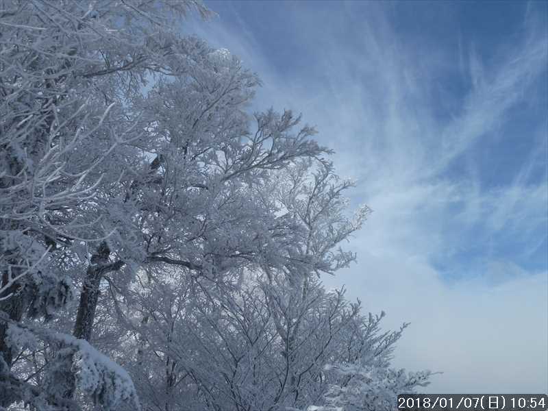 周りの樹々は白一色の霧氷だ。段々と青空が広がり始めたが、生憎と稲村ヶ岳方面の高い山には、まだ雲が絡んでいた。