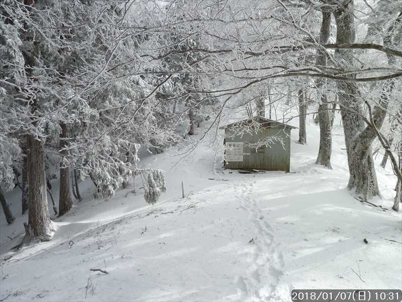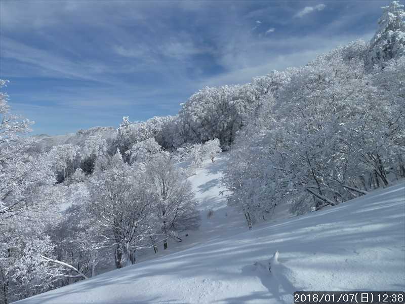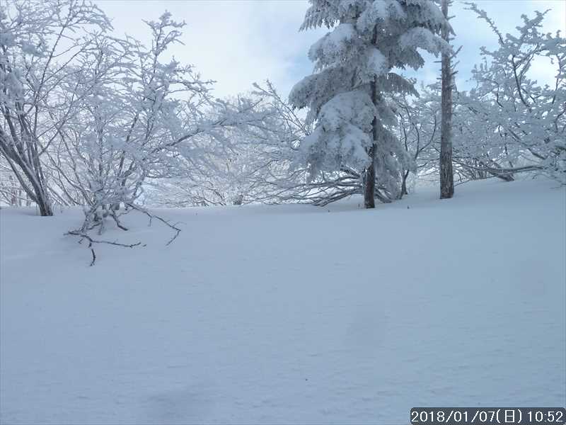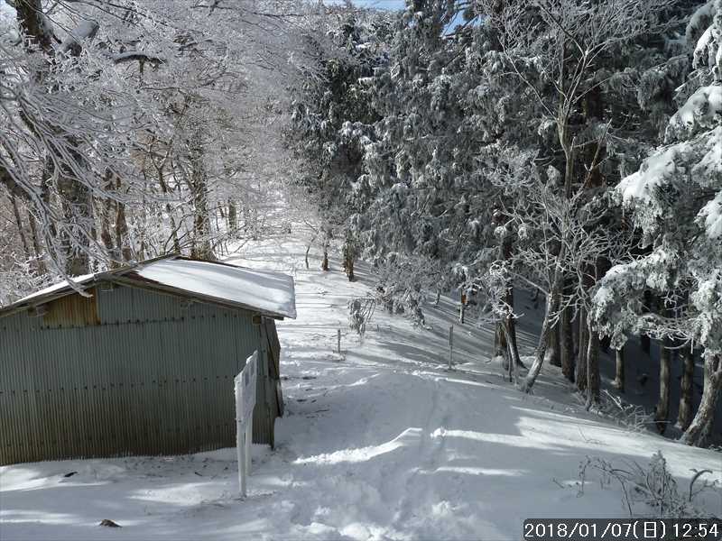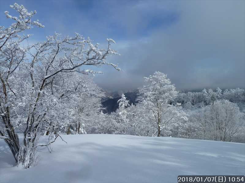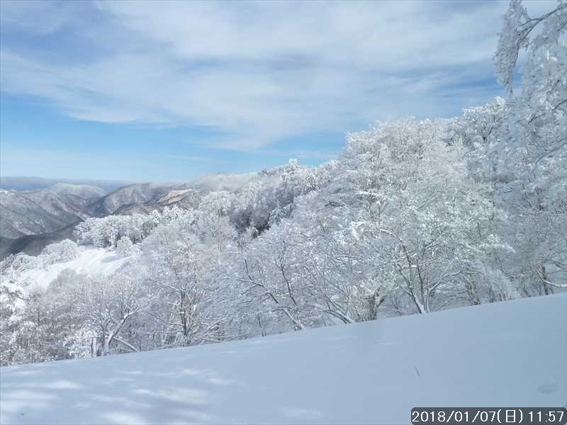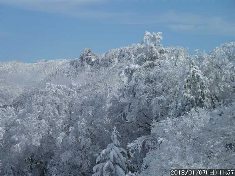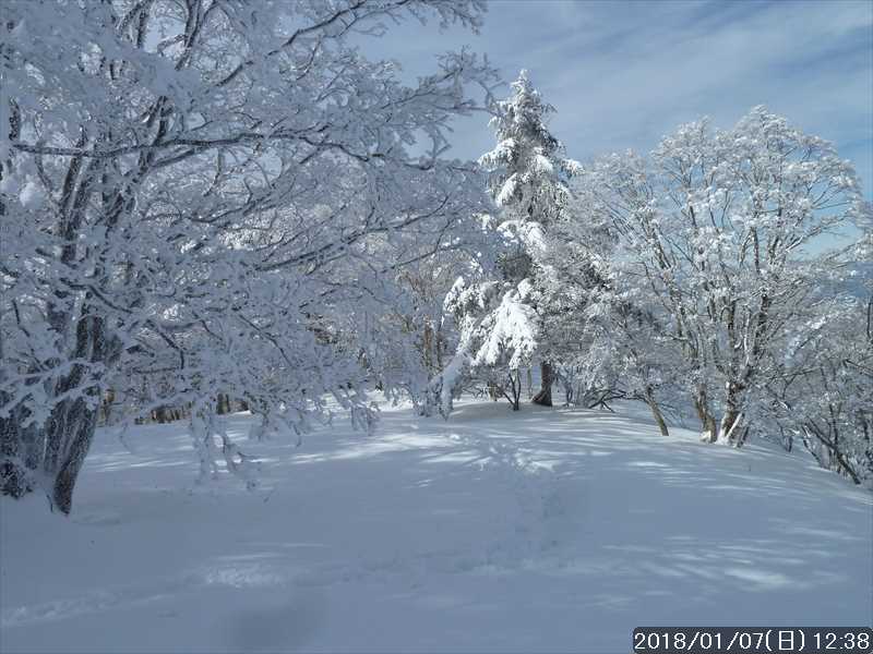 周りの樹々は白一色の霧氷だ。段々と青空が広がり始めたが、生憎と稲村ヶ岳方面の高い山には、まだ雲が絡んでいた。