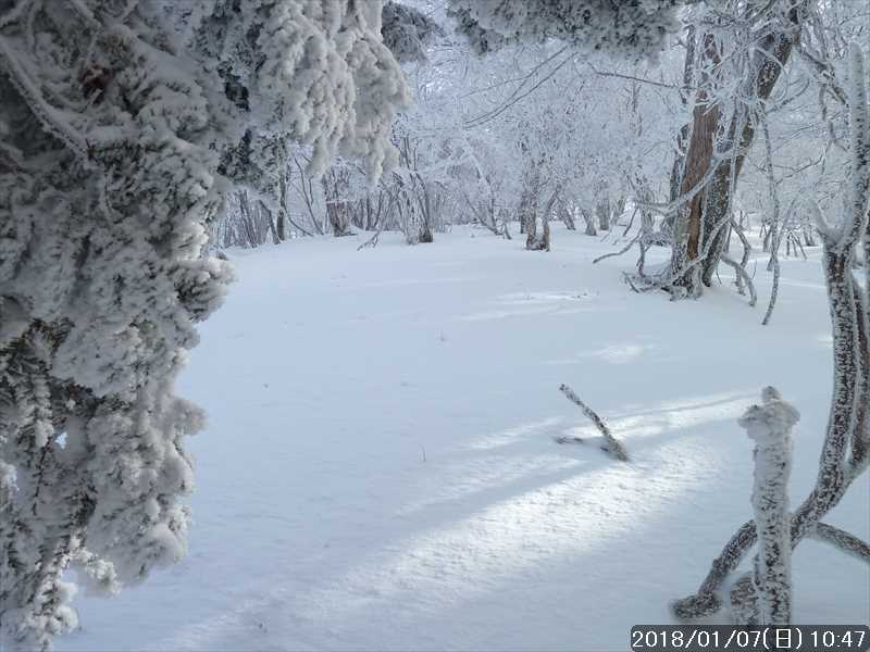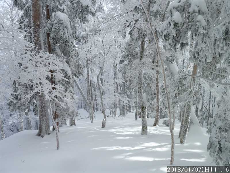 「天女の舞」からP1518を挟んだ反対側の霧氷も素晴らしかった。その霧氷の樹々の中のノートレース地帯でスノーシュー遊びだ。