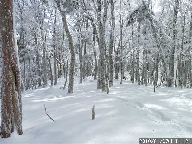 P1518からの下りはトレースがなかった。テン泊された単独さんは熊渡分岐からP1518へは、間違えて横から回り込んだと言っておられ、林道で抜いて行った単独さんはその足跡に釣られたようだったので、ノートレースになっている。その単独さんが大回りされて下って行くのが見下ろせた。