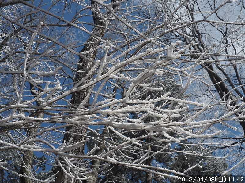 驚きながら四寸岩山の山頂に出ると、先ほどまで曇っていた空が真っ青になった。霧氷に青空、思いがけない光景に出合えた。