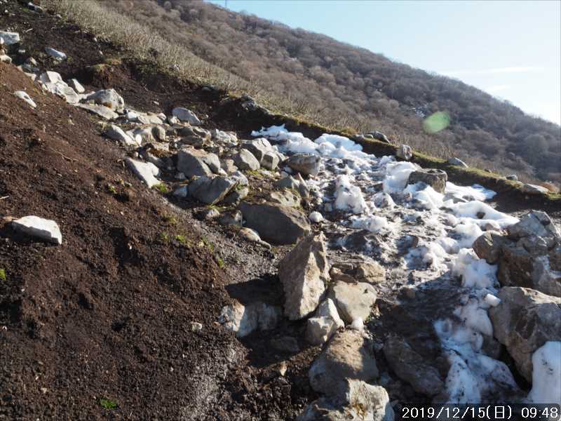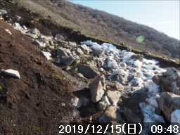 避難所の手前あたりから、所々に残雪が出始め、7合目を過ぎると山道は雪解け水でぬかるみ始めた。進むほど泥濘は酷くなり、靴底にくっつき靴が重くなるので叩きつけるようにしながら登って行く。