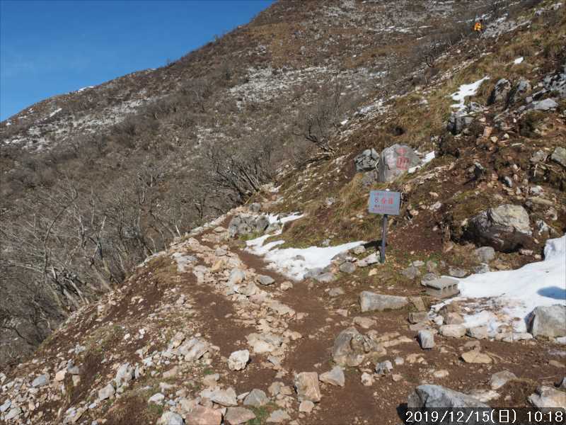 4合目の少し先から、山頂までキツイ登りが続く。気温は低いが風がないので、その急坂を登って行くのに汗をかきはじめる。