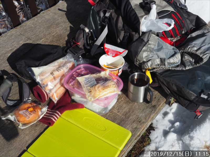 山頂は北風が抜けているので、北風を遮っている施設の前のベンチでウインドブレーカーを着込んで昼食。