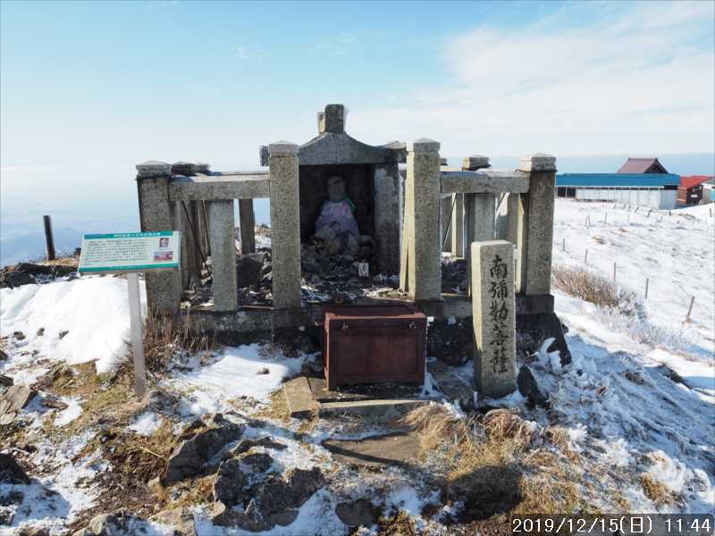 閉鎖されている山頂の建物群(売店・教会・トイレ)を抜けて、山頂表示のある日本武尊像を横に見てとりあえず三角点に向かう。