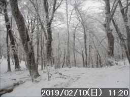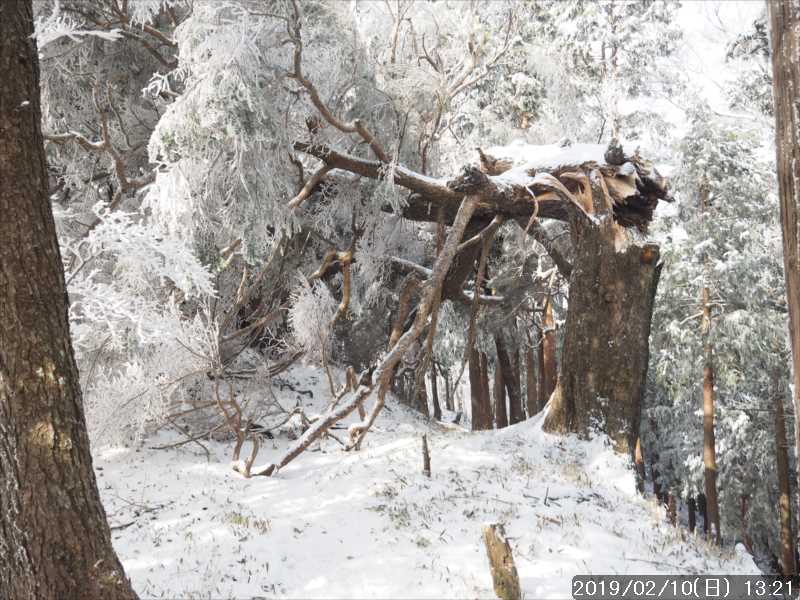高度を上げていくと、深夜か今朝がたに降ったと思われる雪が 1㎝ほど積もっており広葉樹の葉も白くなっていた。