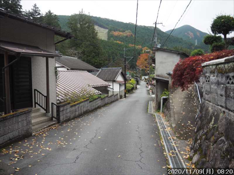 | 11月に入り、気温が一気に下がり始めた。秋を通り過ぎ、冬の気配が濃厚だ。 今年は、コロナ・腸閉塞のための突然の入院・天候不順・等々いろいろな出来事があり、山歩きに出かける機会が減っていた。古希を迎え体力も衰えてきたこともある。 寒いと外出が億劫になるが、山歩きは唯一の運動の機会でもあるので何とか頑張って続けていきたい。 前回の病み上がり後の山歩きから 5日、張っていた足の筋肉がようやく普通に戻った。で、早速頑張って山歩きに出かける。 今回選んだのは、栃尾山。 今年の 2月、恒例の天女の舞へのスノーハイク後の帰りに、時間があったのでその栃尾山に往復している。 今回は、「坪内~弥山ルート」から栃尾山に登る事にした。麓近くで大崩落があり登山道が消滅してしまったため通行禁止になっているが、崩落部分の修復もほぼ終わり、その崩落部分を迂回するように踏み跡が出き始めているようだ。 栃尾山からは、天女の舞経由で熊渡に下山して、紅葉が見頃と思われる「みたらい遊歩道」を歩いて戻る予定とした。 坪内地区には適当な駐車地がないので、天川村役場に駐車する事にした。登山口まで≒3.5㎞の車道歩きが余分になるが、熊渡から「みたらい遊歩道」へ周回するので、歩く距離に変わりはない。 なお、登山口近くの「天河大辨財天社禊殿」前に駐車場があるが、登山者が駐車してよいか不明。 自宅から現地までそれほど遠くはないが、今回は長距離の周回になるので、いつもより少し早目に起き自宅をスタート。 今日も慎重運転で走ったが、早朝のためいつもとほとんど変わらず駐車予定地の天川村役場に到着。 平日の早朝と云う事もあるのか、駐車場はほぼ無駐車状態だった。 天気予報では今日は 1日中 お日様マークが並んでいたが、現地近くまで来ると曇り気味の天気で、時折小雨が落ちてくるほどだった。 小雨で服が濡れるので、ウインドブレーカー兼用の雨具を着てスタート。 役所の先で、県道へ出るため橋に折れると、天ノ川に覆いかぶさるように紅葉した木が目に付いた。 県道に渡らずに左岸側を進むこともできるが、山裾の道でアップダウンがあるので、県道に出て現地に向かった方がベターだ。 坪内地区の手前で県道を別れ、再び天ノ川に架かる橋を渡り坪内地区に入る。 地区内の細い道を進み、天河大辨財天社を左に見て、「天の川温泉」手前で左に折れる。案内ポールの表示には矢印で弥山まで 6時間とあった。 その分岐から少し行くと天河大辨財天社禊殿だ。その前に神社の駐車場があるが、登山者が駐車してよいかは不明。 神社の先を流れる「坪の内川」の向こうに見える小屋の横が栃尾山への登山口だ。 小雨は上がり、スタートして 40分ほどの歩きで、体が温まったこともあるので、神社の前で雨具を脱いでいると、軽トラに乗った神社関係者と思われる白い服を着た人に山に登るのかと 声をかけられ、山道の状態を詳しく説明を受けた。 現在は崩壊地点にぶつかると下に降りる階段が出来ているので、そこから崩壊地を通り抜けていけば、先で山道が繋がっているとの事。 ネットのレポでは、そんな記録はなかったので、いい情報をもらった。 「坪の内川」に架かる鉄板橋を、ダンプが次々と渡っており、その鉄板橋は泥落としのためか、常時シャワーで流されていたので、歩いては渡りにくいだろうと、軽トラの宮司さん?が登山口まで軽トラに乗せて渡してくれた。 登山道の説明・登山口までの送り、親切にしてもらい感謝だ。 前調べと宮司さん?の説明で、小屋の左側が登山口と分かっていたので問題なかったが、その入口付近は日が当たるためか下草が伸びて踏み跡を覆っているので、登山道の入口が分かりにくく、また 入口付近に表示等は見当たらなかったので、知らないと気付かないかも。 下草に隠れた踏み跡らしき所を進み、前方を見渡すとテープが目に入った。そのテープに従い少し進むと、その先の植林地の中は明瞭な踏み跡が続いていた。ややこしいのは入口付近のみだった。 登山口から数分進むと、山腹を平行に進む直進道と右に登って行く分岐に出た。右上にテープがあり踏み跡は濃いようみ見えた。迷ったがテープに従う。 踏み跡は続いていたが、再び数分進むと崩壊地にぶつかった。軽トラに乗った宮司さん?は下に下りる階段があるとの事であったが見当たらない。崩壊地を覗いてみると下の方に崩壊地を渡る道が見え向こう側には階段も見えた。宮司さんの言っていた こちら側の階段は陰に隠れて見えなかったが。先ほどの分岐を直進したらそこに出る事が出来たのだろうか。 今さら戻れないので、崩壊地の上を目指すが、崩壊部分のヘリは登れないので、少し戻り急斜面を滑りながら激登りする。所々にテープがあるが、踏み跡などない。登れそうな所を無理やり登って行く。 数分頑張ると、作業林道?にぶつかった。地形図にある点線の所だ。その道を進んでも崩壊地にぶつかるだけなので、林道