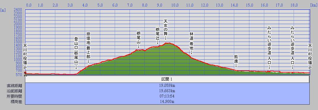 | 607m | 07:47 | ① 天川村役場 P | 0:52 | - | 0:52 | 出発時間 | 05:55 | 15:15 | ||