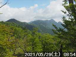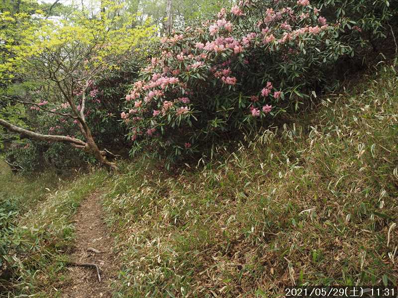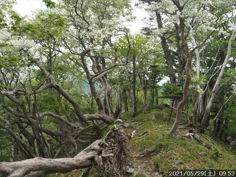 | 今年はシロヤシオの当たり年らしいので、竜ヶ岳のシロヤシオを見に行くつもりだったが、タイミングを逸してしまった。 その振替を兼ねて、まだ散っていないと思われる奥駆道のシロヤシオを見に行くことにした。 ルートは昨年と同じ、90番ポストから大普賢岳までの往復だ。 奇しくも昨年と同日の 5/29だが、昨年のシロヤシオは裏年だった模様でイマイチであったが、さて今年はいかがなものであろうか。 また、昨年は帰路に登頂の予定だった行者還岳に、時間と体力の問題で登れなかったので、リベンジしたい。 が、加齢のため行者還岳どころか大普賢岳まで届くかどうか逆に心配だ。 今日も少し頑張って、いつもより早く起きて自宅をスタート。 今までは天川経由で現地まで言っていたが、天川からだと細い道が長く続くので、距離は少し長くなるが反対側のR169の川上村方面からR309の 90番ポストに向かうことにした。 時間は同じくらいのジャスト 2時間で現地に到着。 今日は土曜日と云う事もあるが、路駐の列がズラリと並んでいた。道幅が広がった最後尾にギリギリ駐車した。 奈良には発出されていないが、大阪・京都・兵庫に出されている緊急事態宣言が 6/20迄に再延長されたのに、無関係のようだ。他府県のナンバーも多くあった。 GPSをセットしようと思ったら無いではないか。大ポカ、忘れて来ている。致し方ないので、スマホ 2台でログを取る事にしてセット。 90番ポストの正面の鉄階段より入山。 歩くたびに踏み跡が濃くなっている様に感じられる道を登っていく。今日は暖かくなると思い薄い上着は車の中に置いてきてシャツ 1枚でスタートしたが、寒いくらいの気温が丁度良く頑張って登っていく。 順調に登り、来るたびに朽ちていくタイタンを見て、先に進むと足元に白い花が落ちていた。この辺りのシロヤシオは既に散っていた。そこから暫く頑張ると奥駆道が通る稜線上のP1458に到着だ。2組休憩されていた。スタートして高度差 400m弱を 50分で登ってきたがコースの標準タイムに同。 稜線の向こう側の弥山・八経ヶ岳は山頂方面に雲がかかっていたが、上空には青空が広がってきていた。今日の天気予報は 12時からお日様マーク。 そこでパンを腹に入れて先に向かう。P1458から下りかけると、行者還岳とギザギザの大普賢岳が正面に見える。大普賢岳までかなり距離があるように見えるが、何とか頑張ってそこまで辿り着きたい。 これから向かうそれらの山々を正面に見ながら少し下り、次のピークP1486へ左の尾根横のゴロ道から登り返すと、そこはお花畑。 最初はクサタチバナの群生地。昨年は蕾で一輪も咲いていなかったが、昨年と同じ日の今日は、数輪フライイングで咲いている花があった。その次の トリカブトの群生地・バイケイソウの群生地を 抜けその先の小ピークから下ると天川辻。その少し先が(旧)鉄塔台地の展望場所だ。 台高方面の展望地で、その方面には雲が広がっていたが、その割に見通しがあり台高の稜線はシッカリと見えていた。 行者還避難小屋はそのまま通過して、水の涸れていた「行者雫水」から、階段場の登りに入る。木の階段は朽ちかけており、途中の何段かが折れたりしてなくなっていたが登るに特に支障はなかった。 階段場を登りこんだ先から稜線に出ると、行者還岳への分岐。帰路に登頂の予定だが、はてさて。 上がってきた稜線をダラダラと下り、P1485のピーク越えをすると、その先から七曜岳への登りに入りルートが険しくなる。 所々にある木製階段は、先ほどと同様にこちらも朽ちかけていて、何段か落ちていたが通過には大きな支障はない。 和佐又分岐を過ぎると、大普賢岳からの周回者とすれ違い、山頂手前の鎖場から七曜岳に上がると 1組休憩していた。 七曜岳への登りが少し厳しかったためだろうか、七曜岳に着いた時にはヘロヘロ状態。 体力的には、ここまでで引返したかったが時間はまだ早い。大普賢岳までは厳しいにしいても、とりあえずは足が運んでくれるところまで行くことにした。 七曜岳の山頂から鎖場を下るときに、手に持っていたストックが引っ掛かり少し危ない思いをして下った。 その先、周回者と何組かすれ違う。 稚児泊手前の大普賢岳の展望地から稚児泊に下ってもまだ時間が早いので、先に進む。 稚児泊の先、ガレ場の分かりにくいところから尾根横に入ると、崖状の所を横切っていく難所だ。鎖の手摺があり、足がかりもあるので、鎖をシッカリと持って進めば問題ないが、足を踏み外したり鎖を持ち損ねると滑落してアウト。 少し長めのそんな場面を通過すると、今度は鎖場の登り。ヤヤコシイ場面が続く。 この辺りを「薩摩転げ」・「内侍落とし」・「屏風の横駆」 と言うらしいが、どの部分がどれに該当するのか分からない。 なお、山と高原地図には「薩摩転げ」は国見岳と弥勒岳の間に表示されているが、その付近は該当するような難所には思えないような感じがするのだが・・。 鎖場から尾根