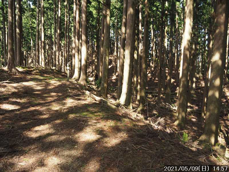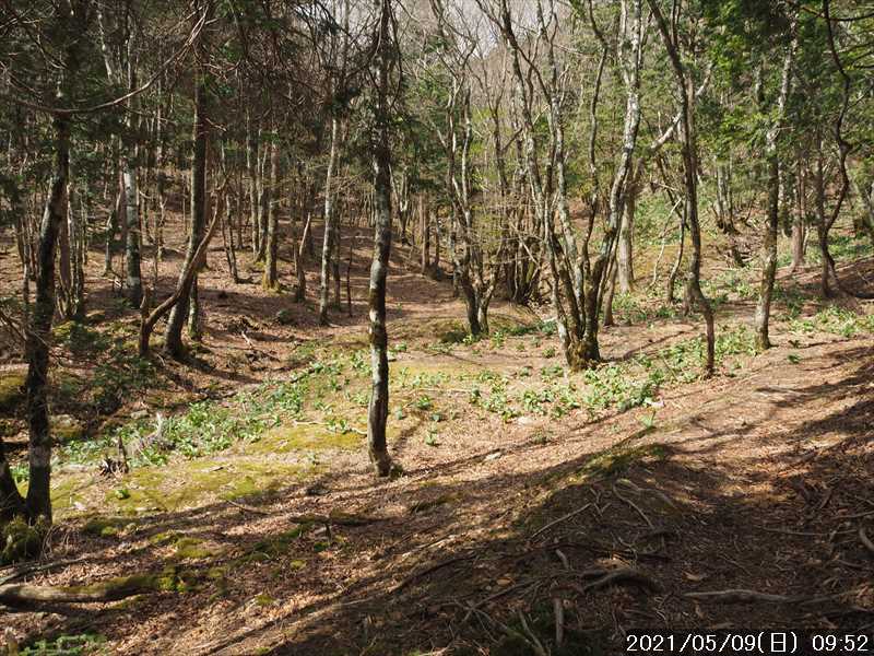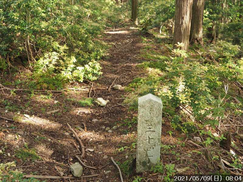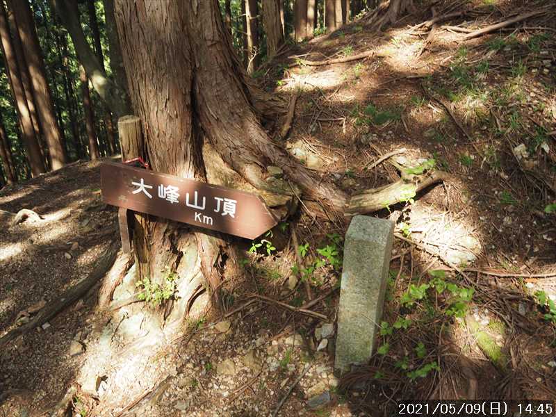 | 大阪・京都・兵庫は緊急事態宣言中(4/25~5/11 →延長になり 5/末まで)なので、人の少ない奈良県の山 と云う事で、上谷から柏木道で山上ヶ岳方面を歩くことにした。 上谷からは、過去 4回登った事がある。とは言っても、最後の 4回目から既に 11年も経っている。 その 4回とも歩いたルートは、阿弥陀ヶ森まで、もしくは大普賢岳方面に向かっており、柏木道をそのまま山上ヶ岳方面に向かうのは、今回が始めてだ。 11年経った今、大普賢岳よりも少し距離のある山上ヶ岳まで行けるか不安があるが、厳しくなれば竜ヶ岳か小笹ノ宿あたりで引返すことも視野に入れる事にした。 長距離で累積標高もソコソコあるので、阿弥陀ヶ森までのタイムを過去と比べてみて体力の衰えも確認してみたい。 自宅から、登山口までそれほど遠くはないが、長距離を歩く予定なので、いつもより早く起きてスタート。 休日の早朝なので道路はすいていたが、歳とともに飛ばすことはなくなったので、以前より到着タイムは 15分ほど遅かった。 川沿いの道から折り返すように急坂を上がって行き、集落の手前にある久久能智神社の前の空地に駐車。 昨日の天気予報では午前 3時から お日様マークが並んでいたが、朝確認すると予報がずれて、お日様マークは 12時からに変わっていた。気温は高く夏日になる模様との事。 到着時は天気予報通りに曇っていて、今は暑くも寒くもない感じ。薄手の上着を着てスタート。 上谷からは 11年ぶりだが、何となくルートは覚えているので、駐車地から奥に進み、墓場への道を左に見送りそのまま直進。開けた栗畑の中の緩い傾斜を直進していくと植林地に入る。 そこから山の急斜面をジグザグに登っていく。道はジグザグにして傾斜を緩めているが、それでもシンドイ登りだ。 そんなキツイ登りが、上谷分岐のある尾根まで続く。駐車地から標高差 240mほどの登りだが、一仕事した感じ。 尾根に上がった地点が反対側の柏木からの道との合流点だ。距離表示があり「←上谷 0.8㎞ 柏木 3.0㎞→」と「←阿弥陀ヶ森 5.8㎞」とあった。 柏木からは歩いたことがないので、柏木道のスタート地点になる柏木から歩いてみたいが、柏木には車の停め所があるのかどうかがハッキリしないので、躊躇っている。 その合流点から、「阿弥陀ヶ森 5.8㎞」に向かって、尾根上の柏木道を登っていく。 尾根を少し進んだところで、「大峯迄 八十二丁」の丁石があった。裏側は「柏木迄 三十四丁」とある。足すと、柏木から大峯迄の全行程は 百十六丁、12.7㎞の距離になる。 所々で傾斜のある部分もあるが、距離が長い分ダラダラと登って行く道が続く。 11年前と違い、道が数メートルほど崩壊して切れ落ちている場面もあったが、そこは上側に迂回路が出来ていた。 また、倒れていたり、木の根っこに抱き込まれたりしていた丁石は、整備され道脇に立て直されていた。 柏木道の中間にあたる五十八丁の丁石も、11年目には倒れていたのを、ひっくり返して裏表とも五十八丁だったのを確認した事を思い出す。 伯母谷覗が近づき、帰路で迷いそうなガレ谷を斜め上に横切り、少し上がるとフラットな場所が続く。アスカベ平でテント場になっているが、低木の多い窪地上の場所なので少し陰気な雰囲気の所だ。 すると、前方からトレラン風の青年 2名さんとすれ違う。こんな早い時間にもう戻りだろうか。 そんな場所を抜けて一登りすると視界が開け前方に大普賢岳から続くギザギザが真正面に。 伯母谷覗に到着だ。ここまで黙々と歩いてきたので思ったより早めに到着できた。 展望岩の先まで出ると、それなりに視界はあるが、今は曇った空模様。天気予報では昼から お日様マークになっていたので、風景は帰路に期待して一息ついたのみで先に進む。 伯母谷覗から女人結界門のある阿弥陀ヶ森分岐までは、覚えていたイメージでは、傾斜のない楽々道だったが、イメージと違い一登り以上あった。 阿弥陀ヶ森のピークを巻いている場面では倒木があったりして、その下を潜り抜けたり・迂回したりで少しややこしかった。 阿弥陀ヶ森分岐の手前で、大普賢岳方面に下っていくトレラン 2名さんの後姿が見えた。 ここまで順調に来る事が出来、時間も余裕が出てきたので、心配していた山上ヶ岳までは問題なさそうだ。 阿弥陀ヶ森分岐にあった案内表示には、「山上ヶ岳 3㎞」。昼食を含めて往復で 3時間位だろうか。 阿弥陀ヶ森から、大峯の雰囲気の良い森の中を歩いていると、前方から メチャデカイ荷物を背負った同年輩の人と、親子ほども歳の違いそうな中年の人の 2人さんとすれ違う。 当方には縦走は夢だな と思いつつ、竜ヶ岳の横までダラダラと登り、左に帰路にピークを踏む予定の竜ヶ岳を見て、その先を下ると小笹ノ宿。 小笹ノ宿は、そのまま通過して、少し先で山上ヶ岳への登りに入る。 阿古滝への分岐の投地蔵辻を過ぎると、右手方向にに山上ヶ岳のピークと大峰山寺の屋根が見えてきた。 その、大峰山