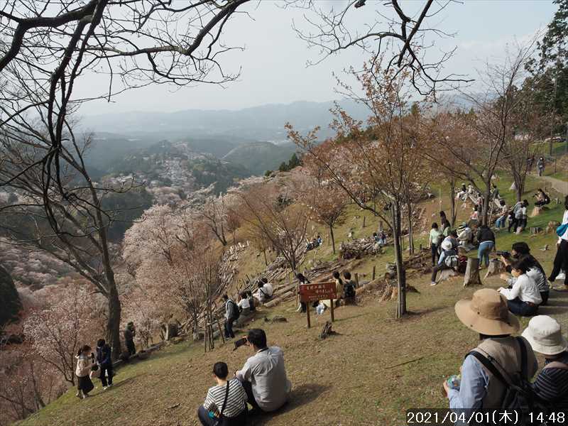 | 今日から 4月 関西地方はここにきてコロナが急速に増え始めた。 阪神間の 5市(大阪・尼崎・西宮・芦屋・神戸)と宮城県の仙台市に、新しく制定された「まんぼう」(まんえん防止等重点措置)が初めて適用されることが検討されている。(→今日 4/1に決定した、期間は 4/5~5/5) 1/7に1ヶ月間の緊急事態宣言が発出されて、その後 1ヶ月延長されたが、関西地区は感染状態が落ち着き病床使用率も下がってきた事もあり、延長期間を 1週間前倒しして、2月末で宣言は解除された。 その後、しばらくは落ち着いていたが、ここにきて急速に感染者が増えてきた。 変異ウィルスの影響らしく感染力が強いので緊急事態宣言手前の「まんぼう」の適用だ。 ワクチンが行き渡り、早く鎮静化してほしいものだ。後期高齢者(75歳以上)のワクチン接種は 5月からとの報道があるが、当方の順番はいつ来るのだろうか。 3月が異常に温かかった事もあり、サクラの開花が 1週間~10日ほど例年より早い。 吉野のサクラも、昨日の夕刊のサクラ情報では、下千本=満開・中千本=7分咲き・上千本=5分咲き とあった。 少し早いかな と思ったが、天気が良いのは今日までで、週末は天気が悪くなるとの予報なので、タイミングを逸しないように今日出かけることにした。 サクラの時期には毎年のように吉野を訪れていたが、昨年はタイミングを逸して行けていなかったので 1昨年以来になる。その 1昨年は喜佐谷から登ったので、今回は鳳閣寺方面から登るか、蜻蛉の滝方面から登るかを考えたが、1昨年に続くが上千本に近い喜佐谷から登ることにした。 吉野は自宅から比較的近いので、普段通りに起きて自宅をスタート。外はもうスッカリ明るい。 通勤時間帯には早かったが、車が増えてきていたので少し時間がかかって現地に到着。駐車場には 5台先着していた。 外気温は 7℃。風もなく日も出ているので寒さは全く感じない。 駐車場の横からの山道を登っていく。「宮滝万葉の道」とネーミングされているが、近畿自然歩道でもある。 沢の右岸沿いに登っていき、途中で渡渉して左岸側に移り、スタートして 35分で御園からの林道に合流。 その林道を少し進むと、分岐があり林道は如意輪寺方面に向かっているが、そこは左の上千本方面の山道に入る。 1昨年は如意輪寺から中千本を通り、蔵王堂に回ったが、その付近は観光客が多そうなので、再びコロナが増えてきた今、密を避けたいので中千本はパス。 その分、他に足を延ばし今回は四寸岩山まで行く予定にした。 分岐から少し上がった日拝地蔵の四辻で左に折れ少し先で、上千本を見下ろす広場に出た。まだ朝早いが、既に多くの人がいた。 ほとんどの人がマスクをしているので、当方もザックからマスクを出して着用する。 上から見下ろす蔵王堂付近は、満開のサクラで満ちていた。昨日の夕刊のサクラ情報では、中千本は 7分・上千本は 5分咲きだったが、中千本は満開・上千本も満開に近い状態に感じた。時期的に少し早いかと思っていたが、週末の悪天候を過ぎると散ってしまうかも知れないので、一番良い時期に来た。満足。 一段上がった花矢倉展望台へも寄る。先ほどと同じような景色だが何枚も写真を撮る。 その少し先の吉野水分神社は今回パスしようとしたが、下から覗くとサクラが咲いているのが見えたので境内に入りその桜も見学。 舗装道路に戻り登っていくが、車道とはいえ傾斜があるのでキツイ。 その先の高城山の展望台も、今回はまだ先が長いのでパスし、そのまま先に進む。 前方に金峯神社の鳥居が見えてくると、バス待ちなのだろうか鳥居下には多くの人たちがいた。 金峯神社は帰路に寄ることにして、往路はそのまま舗装道を進む。 往路は旧道に一切入らず、舗装道をひたすら歩き、吉野水分神社から 1:07、金峯神社の鳥居前から 0:47で四寸岩山の登山口に到着した。 この手前で抜いていったトレランの青年がいて、案内ポールに巻き付けてあった「2020-10-4~2021-4-30 コロナ禍のため長期にわたり閉鎖します」との注意書きを見て逡巡していた。 コロナで山道の閉鎖とは不思議に思ったが、危険なルートでもないのでその注意書きは見なかったことにして入山。 登っていく途中で気づいたが、閉鎖との文言があったので、山頂の先に少し下った「足摺ノ宿跡」にある避難小屋を閉鎖している事と思われる。それならそれでキチンと表記してもらいたいものだ。 モノレールに沿って急坂を登っていると、夫婦さんが下ってきた。その先では大きなザックを背負った人に追いついた。今日はウィークデーだがそれなりに歩いている人もいる様だ。 登山口から 52分で四寸岩山の山頂に到着。以前は三角点のある山頂からの展望は皆無だったが、西方向の立木が少なくなっており、一部に展望があった。逆に山頂横を通る縦走路からの展望は萱が伸びていてそこからの展望はなくなっていた。3年ぶりの山頂だが、その間でも様相が変わっていた。 今日は快晴だが、空気が濁っ