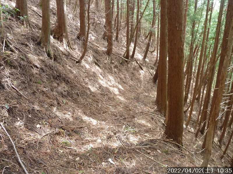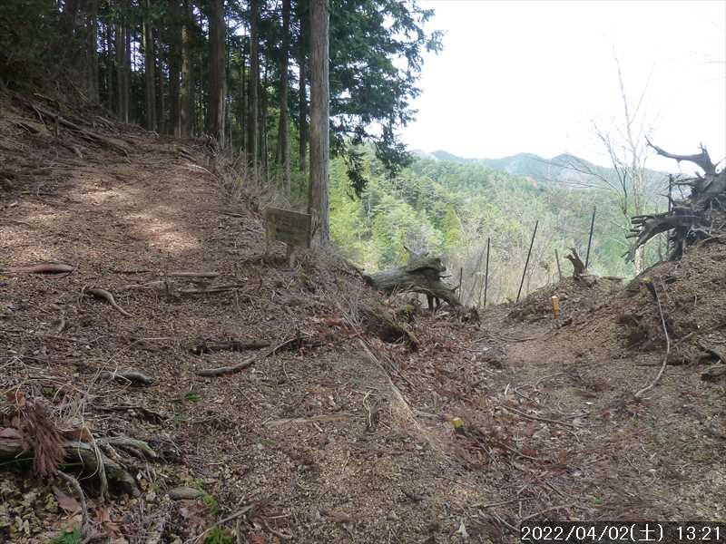 | 膝のケガのため謹慎していたら、いつの間にか桜が満開となった(大阪=3/30、奈良=3/31)。季節の移ろいが早く、もう春から初夏の陽気だ。 膝のケガもようやく治りかけたので、今回はハイキング程度の山で足慣らしすることにした。 以前から繋げたいと思っていた「弘法大師の道(KoboTrail)」だ。吉野の金峯山寺から高野山の金剛峯寺とを結ぶルートで全長は 55.7㎞。 吉野方面と高野山方面を除いた途中のアクセスが悪いので、繋ぐのは難しいと思っていたが、ネットの情報から、途中の天辻峠と切抜峠まで車で行っているレポがあった。その両峠から左右に往復すれば繋ぐことが可能だ。と云う事でさっそく実行にかかる。 吉野側は金峯山寺から小南峠まで歩いたことがあるので、逆コースになるが高野山側から歩く事にした。 出来れば歩いた事があるルートも、この際に歩き直して見たいと思っている。 と云う事で今回は、高野山の金剛峯寺から天狗木峠までを歩く事にした。 往路は忠実に「弘法大師の道(KoboTreil)」を歩き、帰路にこの界隈の最高峰になる天狗木峠近くの陣ヶ峰に登る予定とした。 高野山は自宅から距離はあるがアクセスが良いので、時間的にはそれほど遠いというほどでもないので、いつも通りに起きてスタートしてもよいが、チョットだけ早起きして自宅をスタート。 昨日まではまるで初夏のような天気だったが、今日・明日と寒気が入ってきて花冷えの天気になるとの予報だったが、その予報が的中して、奈良をスタートした時の外気温は 2℃とメチャ冷え込んでいた。 休日で道路は空いており順調に走り、現地の金剛峯寺前の駐車場に到着。広い駐車場はガラ空きで、10台も駐車していなかった。 今回は車道歩きがメインなので、ストックは 1本だけザックに結わえてスタート。雪用のバスケットだったので普通のバスケットに交換した。 ここの外気温もスタートした時と同じ 2℃。風はないが冷えているのでウインドブレーカーを着てスタート。今日は冷えこむとの事だったので、ズボンは冬用のを履いてきている。歩き始めると手も冷たくなってきたのでニットの手袋をする。 すれ違う人もいないが、町中を歩いて行くのでマスクをする。 黙々と歩き、奥の院への入り口の一の橋を左に見てそのまま先に進み、半分くらい埋まっていた高野山奥の院駐車場の先で高野龍神スカイラインを右に見送って、そのままR371を真っすぐ進み、奥の院駐車場から 10分くらいの所で、標識に従い右手前に折り返していく野迫川村への県道53号に折れる。 分岐から暫くはキツイ登り坂だったが、その先はダラダラとした登りに変わり、「樫原 4.0㎞」の案内のある分岐点に出た。そこが地形図にある桜峠だが、峠の案内標識はどこにもなく、道はこの先もまだ登っているので峠に思われなかった。樫原から登って来ると、そこから高野山へ下りになるので峠となっているのだろう、たぶん。 桜峠から少し進むと左側(北)が開け、山並みの向こうに金剛山が頭を出していた。その先道路わきの斜面に残雪が出てくるようになり、スタートして 1:34’で天狗木峠に到着。 今日の「KoboTrail」はそこまでの予定だったが、スタートして 7㎞弱 ズーっとダラダラとした車道のアスファルト道だった事もあり普通に歩けたので、思ったより早く到着した。 で、もう少し「KoboTrail」を先まで様子見に行くことにした。 工事で通行止めになっている野迫川村への県道53号を右に見送って左側の「村道 上・高野線」に入る。 村道とはいえ県道以上の道だ。天狗木峠から 7~8分で左にチェーンで通行止めになっている林道に折れる。 分岐には「KoboTrail」の案内はどこにもない。「KoboTrail」は吉野側からの一方通行みたいで、反対の高野山側からだと、分岐には案内がないので注意が必要だ。 アスファルト道から開放され今日初めての地道に変わった。とは言っても整備された林道、普通に歩ける。 そんな林道を歩いていると、「KoboTrail」のビニールテープの案内が風に靡いていた。今日初めて見る「KoboTrail」の案内だ。 少し進むと、林道はチョットしたピークを左から巻いていく所に出たが、そのピークに三角点があり踏み跡もあるので、寄って行く事に。直ぐの所に四等三角点があったが山名表示はなく山と高原地図にも山名はない。 三角点から先に進み左からの林道に合流し、高低差のほとんどない林道をしばらく進むと林道分岐があり右の林道の横には錆びついた放置車があった。山と高原地図に鐘割峠とある地点であるが、表示はなかった。 地形図を見ると、そこから南に下る点線のルートがあり、先ほど分かれた「村道 上・高野線」に繋がっている。距離も余りなさそうだったので、ダメなら引返すつもりで行ってみる事にした。 入口こそ荒れていたが、少し入るとルートは明瞭になりジグザグに下っていく。安心してドンドンと下っていく。 そんなんで安心して 10分ほど下ると、谷に近づき炭焼きの石積みの所の先でルートが消