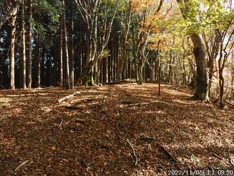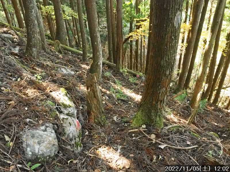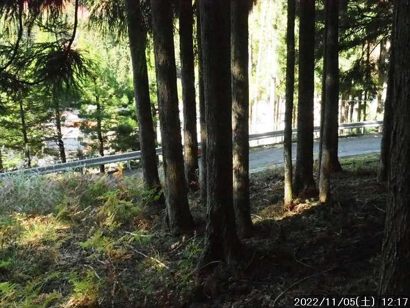 | 当初は近畿の中北部の半国山に行く予定にして、GPSルートほか準備していたが、天気予報を見ると日本列島は秋晴れなのに、近畿の日本海側方面のみ天気が悪く、半国山は一日中曇マークだった。 で 急遽、秋晴れの近畿南部に予定を変更して、観音峯山に行くことにした。 いつも拝見させてもらっている「登山日和」さんのホームページで、観音峯山の北側に位置する三ツ塚の北西尾根から下ったレポがあった。そのレポを参考に近々歩こうと思っていた。その実行に変更だ。 現地の洞川は自宅から交通アクセスがよく、今日は休日のため通勤渋滞も考えられなく、また今日の行程は短いほうなので、ユックリのスタートでもよいと思ったが、今は紅葉の季節。 現地の駐車予定地は、紅葉で有名な「みたらい渓谷」の上側からのアプローチ部分でもあるので、着く時間が遅くなると駐車に苦労するかと思い、朝早く起きるのはつらい季節になったが頑張って早く起き自宅をスタート。 渋滞もなく、信号に引っかかる回数も少なく順調に走り、途中コンビニに寄っても自宅から 1:35’で現地に到着。距離は70.1㎞。 予想通り駐車場には既に多くの車が駐車していた。2台分空いていた駐車枠に駐車。駐車枠以外にも止められるので、あと 10台くらいは停められる 外気温は 4℃、風がなく日差しもあるのでそれほど寒さは感じない。夏用のズボンとシャツの上に薄い上着を着てスタートしたが、さすがに寒さを感じた。しかし、時間とともに気温が上がるし歩けば体が温まると思いそのままスタート。ただ手は冷たかったのでニットの手袋をした。 休憩施設の横から山上川に架かる吊橋を渡り、対岸から観音峯山への登山道に入る。 遊歩道のようなルートで、ヤヤコシイ場面はなく傾斜のキツイ所は丸太階段で整備されている。少し荒れてはいたが。 歩き始めて 10分くらいの所で「観音の水」の水場。湧き水らしい水が流れていた。スタートしたばかりなのでそのまま通過。 そこからまた 10分ほどで第一展望台への分岐。そこは生い茂ってきている樹木で展望のないのは分かっていたが、一応展望台まで往復する。 元に戻り先に進む。傾斜が緩く歩き易いのでドンドン進み、スタートして 0:47’で休憩施設のある観音平に到着。休憩するほどでもないのでそのまま通過。 観音平から階段を上がった少し先で、「観音の岩屋」への分岐。何時も寄って行くので今回も往復に向かう。 往復 10分の寄り道をして、観音の岩屋を西側から巻いて、急傾斜の所をジグザグに観音の岩屋の上部側に上がる。そこから始まる緩やかな尾根を登って行くと観音峯展望台。文字通りの展望地だ。 2組のグループがいて、我がもののように石碑の前に座り込んでいた。カメラを構えたら一応どいたが、当方が移動すると元に戻っていた。 秋晴れの天気で、大展望があるので暫くその景色をみてから、先に進む。 観音峯展望台から少し下った所で新たに出来た林道を横断して、観音峯山の前衛峰のP1285を超えて、観音峯山との鞍部に下ると、そこにも林道が出来ており、その林道を横断。 観音峯山への登りに掛かると、落ち葉で踏み跡が分からない部分があり直登する。傾斜があるので直登はシンドイ。すると単独さんが下ってきて、そこで薄い踏み跡を発見。ジグザグに登って行くルートに乗りキツサは少しマシになった。 観音峯山へはスタートして 1:51’で到着。山頂は無人。 そこまで出会った人は観音の岩屋を巻く所ですれ違った単独さん・観音峯展望台の 2グループ・観音峯山への登り途中ですれ違った単独さん、それと追い越した年輩の単独さん、の 5グループ。縦走していった人もいるかもしれないが駐車していた台数にしては少なすぎる。やはり「みたらい渓谷」の紅葉見物者が多かった模様だ。 観音峯山は展望も何もないのでそのまま通過して先に進む。 この少し手前から紅葉がみられるようになっていたが、稜線上の紅葉は終盤を迎えている感じ。 落ち葉の多くある稜線上を軽いアップダウンをして、倒木が多くなると三ツ塚に到着。 三ツ塚には地名表示はなく、道標にマジックで「三ツ塚」と書かれたものがあるのみ。 ルートが通っているピーク付近は荒れて展望はないが、ピークの東側に樹木がない部分があり一部に展望も開けている部分もあるのでそこに移動して、時間は早いが昼食にする。何度かその場所で昼食をしたことがある。 昼食中、日が照っているうちは寒さを感じなかったが、浮かんでいる雲に日が隠れると急に寒くなる。冬の到来が間近に感じられた。 昼食後に定番のコーヒーにデザートで少しユックリしてから下山に向かう。 下山ルートは三ツ塚の北西の尾根。初めてのルートだ。 昼食を取ったピーク付近の東側から、反対の西側に移動して、そのまま下って行ったが、それが大間違い。広い斜面で、そこそこの傾斜に見えたので最短方向へ進路をとった。 植林の中で、杉の落ち葉が多くて傾斜の割に滑らないが、
