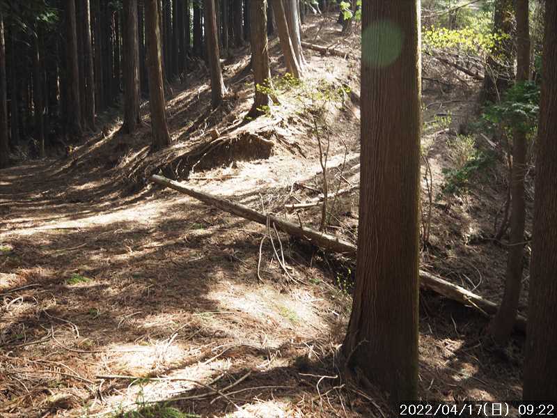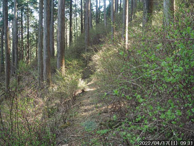 | 「弘法大師の道 KoboTrail」ルート繋ぎの 2回目 今日の行程は、歩く距離もそれほどなくアップダウンはあるものの標高差の少ない歩きなのでいつも通りに起きて自宅をスタート。 帰宅までのガソリンが微妙だったので、寄り道になってしまうがいつものGSで給油。 プーチンのウクライナ侵入等でオイルの価格が高騰しており、全国平均でリッター当たり 170円を越しているとの報道がある。奈良は少し安く、160円台の半ばで推移している。 今日の価格は店頭表示 164円。カード割引で157円、スマホアプリ割引きで 152円だった。47.8㍑入ったので 7265円だった。 当方の車は、長距離モードではリッター当たり 14~15㎞は走るので、概算キロ当たり 10円。今日は現地までの往復で 180㎞ほどなので、ガソリン代は 2000円弱くらいかかるかな。 (メーター表示の AVGは実燃費から 15%ほど甘く出る感じ) 休日なのでスンナリと走れ、現地の到着。 通行止のA型バリケードをずらして、東小屋の横の広場に駐車。5月末まで天狗木峠から高野辻まで道路改修工事で通行止めになっているためだ。 昨日から寒の戻りに入り、気温がグッと下がってきた。しかし天気は良いので日が出てくるとそれほどでもない。自宅をスタートした時は 3℃だったが、現地の現在気温は 5℃。青空が広がっており風もないので寒さは感じない。 天狗木峠から村道を暫く歩き、左の林道に折れる。林道の入り口は鎖で塞がれており、関係者以外進入禁止の案内がぶら下がっていたが、「KoboTrail」のルートなので鎖をまたいで進入。但し「KoboTrail」の案内はどこにもない。 先々週、高野山からスタートして時間が余ったので鐘割峠まで足を延ばしているので、鐘割峠までは重複して歩く事になる。鐘割峠からスタートできないので致し方ない。 スタートして 26分でその鐘割峠に到着。先々週は鐘割峠の表示に気が付かなかったが、谷に下る分岐の所に「鐘割峠」の表示があった。 峠に鎮座している廃自動車を横目に先に進む。 鐘割峠までは轍の跡があったが、峠から暫くした所で林道上に土砂が崩れ落ちてきていたので、その先は車の通行は不可。人が通過するのは全く問題ない。 その先、林道か杣道か分からないような道になるが、所々に風になびいている「KoboTrail」のリボンを確認しながら進む。 そんな杣道が尾根横にトラバースして行くので、何の疑いもなくその道を進む。少し進んだ所でシッカリとした踏み跡は続いていたが、両脇からトゲのある低木がルート上にはみ出してきた。 「KoboTrail」のトレラン者だと薄着なので、トゲにやられそうだ などと思いながら進んで、ふとGPSを見るとルートから外れている。進んでいたルートは地形図に点線で乗っているルートであるが「KoboTrail」ではない。慌てて引返す。 間違えた分岐点に戻ると、「KoboTrail」は城本山からの尾根先の所だった。広めの尾根先で明確な踏み跡がなく、例によって高野山側からは案内表示もなかったので、ハッキリとしたルートのある巻道の方へ進んでしまった。約 10分の時間ロス。 その尾根先からダラダラとした登りに入り、ピークの城本山は「KoboTrail」は巻いているので、「KoboTrail」に従う。前回同様に往路は忠実に「KoboTrail」を歩く予定だ。 ピーク横を通過すると下りに変わり、尾根上を複雑に下っていく。先ほどのピークから 100mほど下ったコブみたいなところが P839、山と高原地図にはスナダリ峠となっている所であるが何もない単なる通過地点。 そのコブを超えて大きく登り返すと P900の高塚。手作りの表示があり、熊出没注意の看板もあった。 その付近から「止め山」の表示が目だって多くあった。松茸山の様だが、どれくらい採れるのだろうか。 ピークで尾根曲がりして、少し先の尾根肩の所でルートが別れていた。例によってこちらからは分岐表示はない。右のほうは直線に激下りいているが、1mくらいの幅で両脇に有刺鉄線とネットが張ってある。 GPS方位はその方向を示し、ルート横には人が入らないようにブロックしているので、そこを下る。 激斜面の土の上に落ち葉が積もっているので滑る滑る。幅が狭く横にジグザグに振る事が出来ないので体を横向きにしたりして下っていく。滑って咄嗟に横のネットを掴むと有刺鉄線があるので、絶対に掴まないように心して下る。緊張のせいか長く感じた。 そんな激坂の下部ではネット間の幅が広くなったので、ジグザグに下り、やがて緩やかな下りに変わり、鞍部に出ると、「紀和隧道上 金峯山寺蔵王堂から 42.6㎞ 金剛峯寺根本大塔まで 13.1㎞ 地点です」の案内が木に巻きつけられていた。紀和隧道上とあるが、山と高原地図には紀和峠とある所で、トンネルの真上。 鞍部から下を覗くと、アスファルトの白線が直角に足元に向かっている。トンネルに入る手前のようだ。 その鞍部からジグザグに下るルートがあるが、ザレた急斜面なので滑ったら転げ落ちて行きそうだ。そこから下るには勇気がいりそう。 反対側に登り返し、