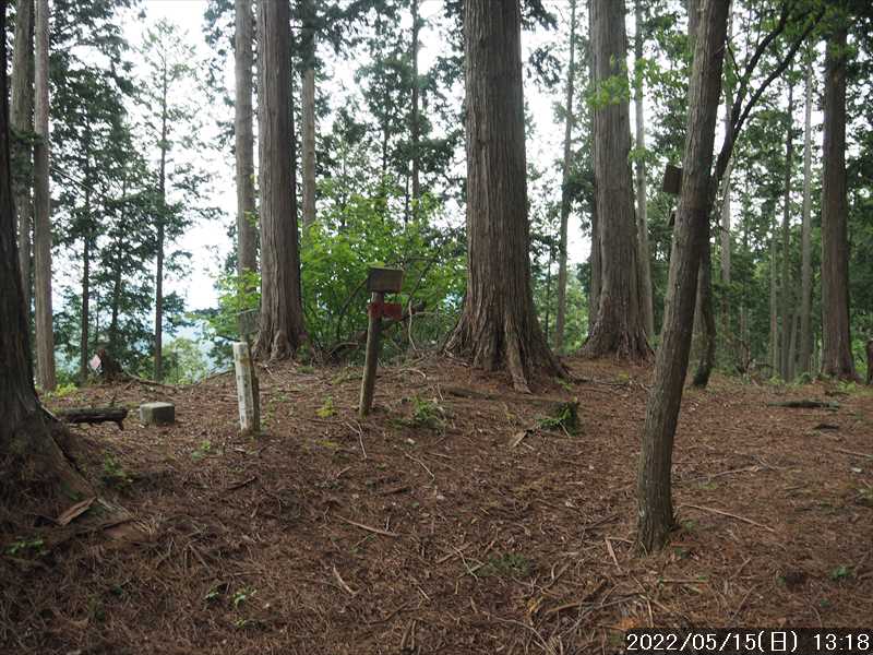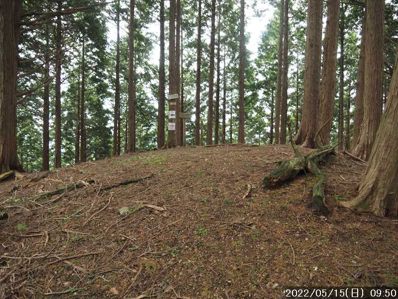 | 「弘法大師の道 (KoboTrail)」の続き 前回は高城山まで繋いだので、今回は反対側の切抜峠から高城山までの往復。切抜峠までは峠の下の(旧)川合トンネルからのアプローチだ。 まだ梅雨には入っていないが、プレ梅雨みたいな感じで雨がちな天気が続いている。昨日も雨だったが、夜には止み、今日には回復して天気が良くなるとの予報。ただし天気が良いのは今日 1日のみ。 雨上がりの山行は汚れるので避けたいが、貴重な天気なので行動開始。 今回の目的地は自宅からのアクセスが良く、当日は日曜日なので頑張って早く起きて行く事もないが、気が張っていたのか何時もより早く目が覚めた。床離れしやすい気候になってきたのでそのまま起床。 休日で道路も空いており、心配していた国道から現地までの道も全く問題なく、予想より早く到着できた。 今回の「KoboTrail」のスタート地点とした切抜峠へは、峠の真下にある(旧)川合トンネルの西口から切抜峠に上がるルートとしたので、国道からそこまでの道と現地に駐車地があるか心配だった。 アプローチする道路は、現在の新川合トンネルが出来るまでの旧道だった道なので、細い部分もあったが全く問題のない道だった。ただし舗装路面上には杉(桧)の落ち葉が多く落ちて、と言うか轍部分以外は積もった状態の部分もあり、所々で小さな落石も見られた。走るには問題なく、駐車地も広い路肩が多くあり心配するような事はなかった。 そんなんで現地に到着すると、なんと先着車が 3台も駐車していた。当方に先立って到着したワンボックスのお兄さんは両手にポリタンクを持って峠に上がって行き、当方が準備を終えた時に峠から戻ってきた。 今日は5/15、「KoboTrail」は確か 5月の開催だったような・・・。 準備を終えスタート。今日の外気温は 8℃、少し肌寒いが風がないのでそれほどの寒さを感じない。 トンネル手前の踏み跡から入山し登って行くと、壮年の 2人さんが重たそうな荷物を抱えて先行していた。 ワンボックスより先に到着していた車の人達だ。 追い抜き際に訪ねると、やはり「KoboTrail」のイベント日。参加者は 150人くらいとの事だった。 まずい日に来たな と思ったが、今日の行程は余裕があるので、トレラン者に遭遇してもユックリ見送りながら歩いて行けば良い。 時間からして、今日の目的地の高城山へ着く頃か、引返すころにそれらの集団と遭遇すると思われる。 スタートして 5分程度で切抜峠に上がった。丸太階段のある明確なルートだったが、階段の丸太はほとんど朽ちていて、崩れた部分もあって登るのに苦労した場面もあった。 登りでは気にしなかったが、帰路で下った時には、片側が急斜面になっていて歩く幅の狭い部分は少しビビり気味で下った。 先ほど抜いた 2人さんは何回か往復かしている模様で、支援物資が固めておいてあった。 峠は尾根を大きく切通した様になっていたので、横側から尾根に上がる。短い距離だが滑りやすい足元で急登。上の方はロープがあった。 尾根に上がるとその先は明確な「KoboTrail」のルート。ただし小刻みなアップダウンが多く、感覚的には絶えず登ったり下ったりしている感じだ。 切抜峠から 33分で黒尾山に到着。地形図には山名はない。三等三角点があり基準点名は「黒尾」、基準点名から黒尾山としている模様。展望もない通過点のようなピークなのでそのまま通過。 ダラダラと下っていくと、左から林道が接近してきた。「KoboTrail」は尾根上を進むが、林道は少し先でも再び接近してきた。帰路でトレラン者と遭遇したら林道歩きでもいいかなと思いつつ進む。 黒尾山と次の天狗倉山との中間付近のピークに上がると、東方面に展望が出てその先暫く展望稜線になった。スカッとした晴ではないが雲は高く展望が効いているので大峯の稜線が空と境をなしていた。大峯の北半分が丸見えだった。 そんな景色を見ながら歩いていると、やがて前方に天狗倉山と高城山も姿を現してきた。 その天狗倉山への登りが始まり、今までの小刻みのアップダウンと異なり、暫く登りが続く。傾斜がきつい所はジグザグにルートが出来ていたが、落ち葉で分かりにくい部分も多かった。ルートを外すことはなかったが、たとえ外しても歩ける所を歩けば迷いも危険もないので問題ないが。 登り切った所で山頂に上がったかと思うも、山頂はもう少し先の一登りした所。 天狗倉山の山頂に上がると、山頂表示が多くぶら下がっていた。山頂は明確なピークで、この手前で見た時も山容がハッキリしていたが、植林のため展望はない。 すると、屈強な壮年のトレラン者が登ってきて、走り抜けるように下って行き前方に消えていった。 天狗倉山の山頂も展望はないのでそのまま通過し下っていく。 暫く下って、アップダウンが始めると 2人目のトレラン者が追いついてきてそのまま抜いて行った。 その先から、高城山への登りが始まり、所々にある急登を頑張って登って行く。 山頂が近づき始めた時、