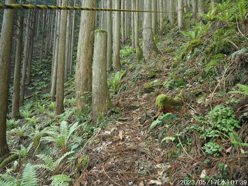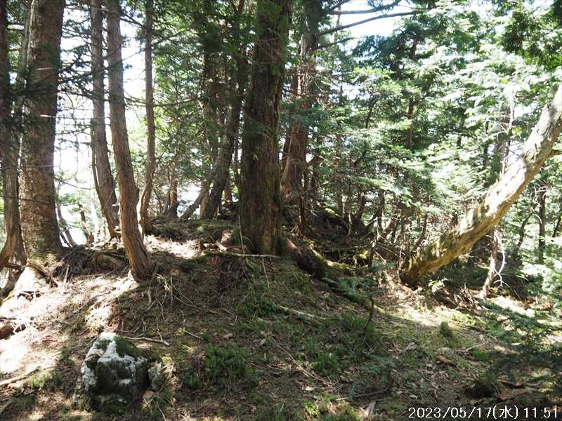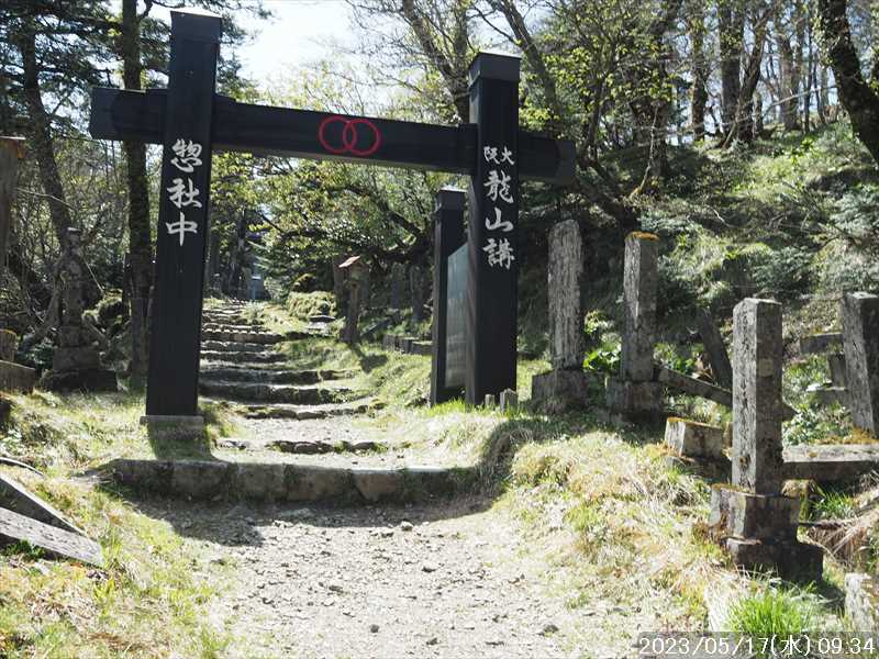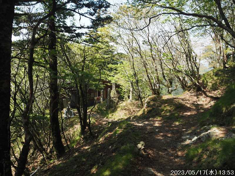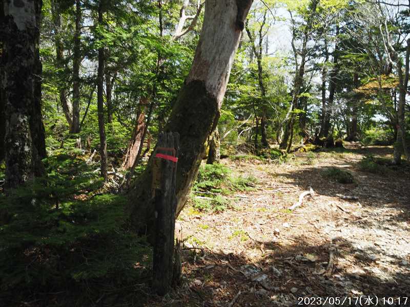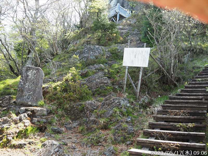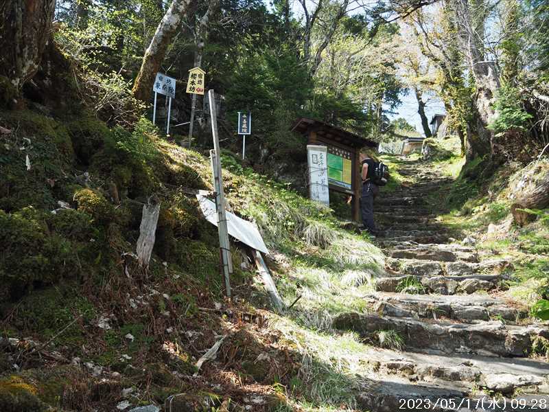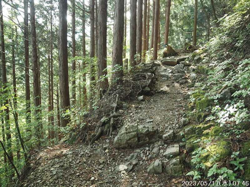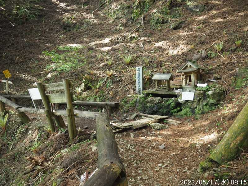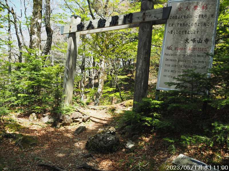 | 執以前にネットのレポで気になっていたルートから、山上ヶ岳経由で先週(5/9)も行った阿弥陀ヶ森への往復。 林道高原洞川線(毛又橋~五番関トンネル)の途中から、一本松茶屋の先で表参道に合流するルートだ。浅い谷筋の等高線が詰まっているのでルートが無ければとても歩けなさそうであるが、レポによると昔の杣道が残っている雰囲気でロープも設置されているとの事で距離は短い。 歩く予定の阿弥陀ヶ森まではロングルートになるので、頑張って早く起きて自宅をスタート。 早朝なので通勤渋滞には無縁で、順調に走り五番関トンネル手前 800mにある駐車地に到着 五番関に行くために何度も通ったことのある林道で、そこに駐車している車を何度か見かけた事をあるが、そこに登山口があるのは知らなかった。駐車していたのは登山者の車かは不明だが。 駐車地の前に側溝があるので、脱輪しないか確認して駐車。 準備する前に登山口を確認しに行く。橋を渡った所に登山口がある筈だがマークは何処にもない。明確な踏み跡もない。 1m程の岩の左右に山側に登れそうな所があった。雰囲気的には岩の右で川の横側。視察のため少し入ってみると先のほうに道が繋がっていた。 車に戻り行動準備。 到着時の外気温は 11℃だが、今日は急激に暑くなるとの予報。各地で真夏日となり群馬県では猛暑日との予測も。しかし今は若干肌寒いので薄い上着を着てスタート。 先ほど確認した登山口から入山。 林道から少し入ると踏み跡がハッキリとして来た、分かりにくいのは入り口付近だけだ。 川横を離れる所から急な登りに変わる。その登り部分にはロープが設置されていた。しかも山道(杣道)の両側にロープが張ってあった。何時頃設置されたロープか分からないが、植林の木に巻きつけられた部分が、木が成長してロープが食い込んでしまっていた。 登りなのでロープは必要ないが、ロープのおかげでルートは間違いようがない。荒れてはいるがルート自体もハッキリと分かる。ただし傾斜はキツイ、激登りだ。ほとんど朽ちているが丸太階段の残滓が各所に見られた。 頑張って登っていると湿気も多いようで汗が噴き出してきた。 一本松茶屋の先の参道に出合うまで 20分ほど、標高差 120m程の激登りだった。 参道に合流すると、そこからは緩い傾斜のダラダラ登り。しかし先ほどの激登りで足に疲れが出たのか一歩一歩が重い。 汗が吹き出ていて服が濡れてきているので脱ぎたかったが、洞辻茶屋で一息入れようとそのまま頑張る。 スタートして 1:11’で洞辻茶屋に到着。 歩き始めてそれほど経っていないのにかなり疲れた。何年か前(2015/7/12)に五番関から山上ヶ岳に向かう途中で暑さのためヘトヘトになり、この洞辻茶屋にヨタヨタで到着したことを思い出す。その再現だ。 先日NETで購入したばかりの薄い上着を脱ぐと、下のシャツはビッショリ。パンで小腹を満たしているとビッショリのシャツが冷たくなってきた。 山頂までコースタイムで 1:00’なので、時間は十分。慌てず体力と足に合わせ適当に進む。 洞辻茶屋から 8分ほどの小さな茶屋(陀羅尼助茶屋・松清店)を続けて 2つ抜けると山頂への分岐。いつも通り往路は左の鐘掛岩経由方面へ折れる。 途中の鐘掛岩の展望台と西の覗は、先を急ぐことにして往路ではパスした。帰路に寄れたらと寄ろうと思ったが結局帰路にも寄らなかった。 山上ヶ岳は一等三角点だけに寄り、疲れてはいたが何度か歩いたルートなので予定通り阿弥陀ヶ森を目指す。 山頂からは下りなのですんなりと歩くが、帰りの登り返しが嫌だなと頭にちらつく。 鞍部の小笹ノ宿を通過して、反対側に登り返しに入ると急に足が重くなった。が それほどの急坂でもなく、雰囲気も良い場所なのでそれなりに進み 8日ぶりの阿弥陀ヶ森の女人結界門に到着。 その 8日前は結界門の所から阿弥陀ヶ森のピークに登ったので、今回は柏木道を伯母谷覗方面へ進み阿弥陀ヶ森の東側からピークを目指す。 先週は緩い傾斜を楽々と下った場面だが、その傾斜の緩い登りがキツク感じて阿弥陀ヶ森のピークに上がる。一応ピークを踏んだのみで反対側へ引き返しにかかり、往路では登らなかった竜ヶ岳に向かう。 竜ヶ岳へは、横を通過していく奥駈道の近接点付近から適当に山頂を目指す。 倒木を避けながら登って行くとピーク手前に大岩が出てきた。右から巻いていると何となく踏み跡らしき道筋が出てきた。 それをたどり大岩の反対側に上がるとその付近がピークに見えた。山頂表示はないかと見回すも見当たらず。少し先も似たような高さなのでそこに移動するもそこにも山頂表示はない。 地形図の・1725の(・点)付近にも見当たらず。反対側から見ればあるかと思い先ほどのピークに戻るもやはり無い。致し方ないのでピークの写真だけ撮って小笹ノ宿目指して下って行く。 しかし倒木が多く、大きく迂回すると変な方向に下ってしまうかもしれないので、登ってきた方向に少し戻ってから下ると奥