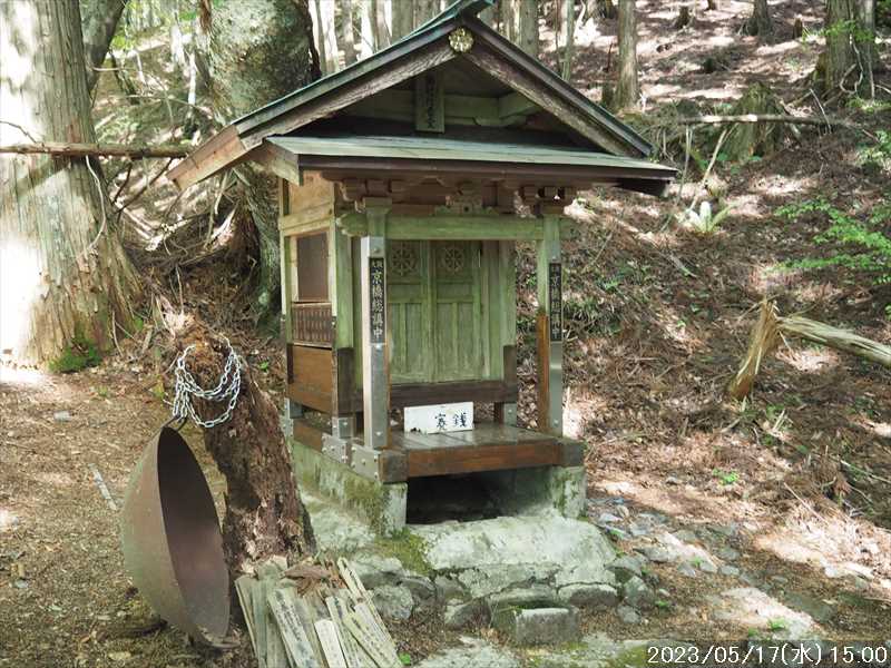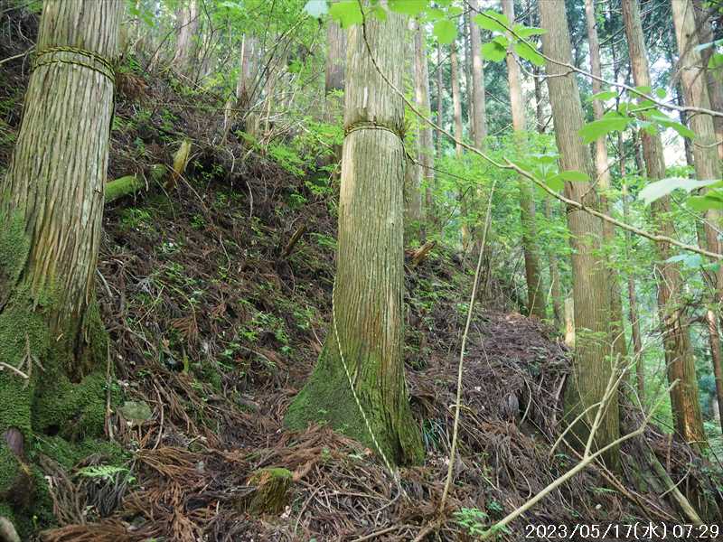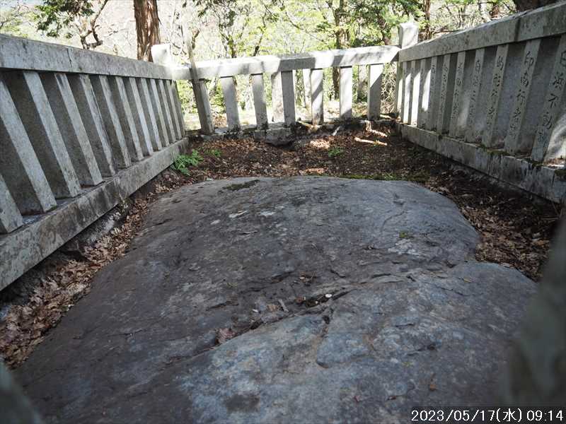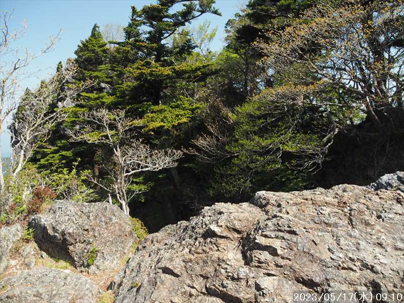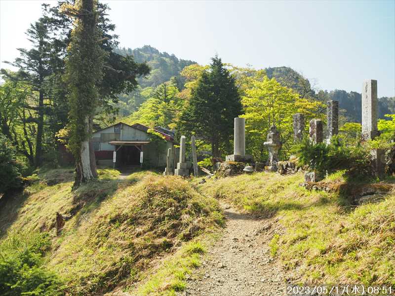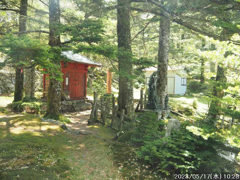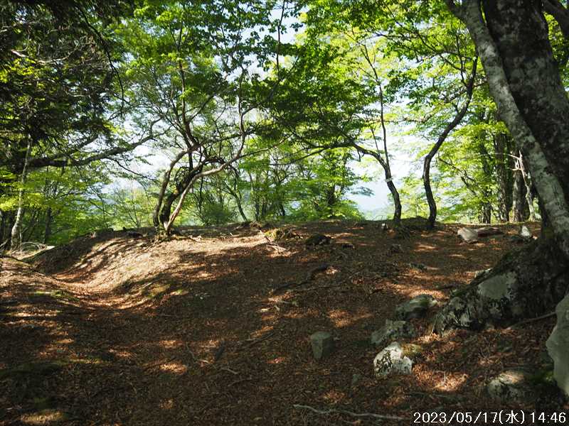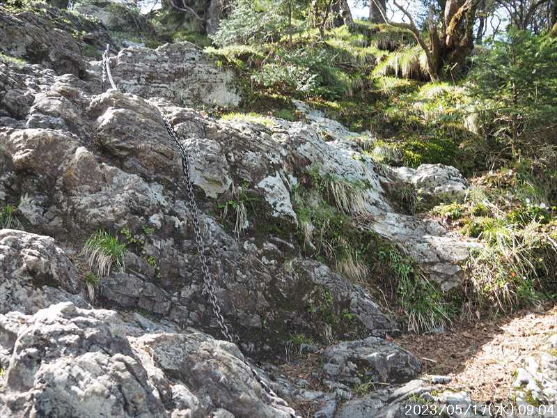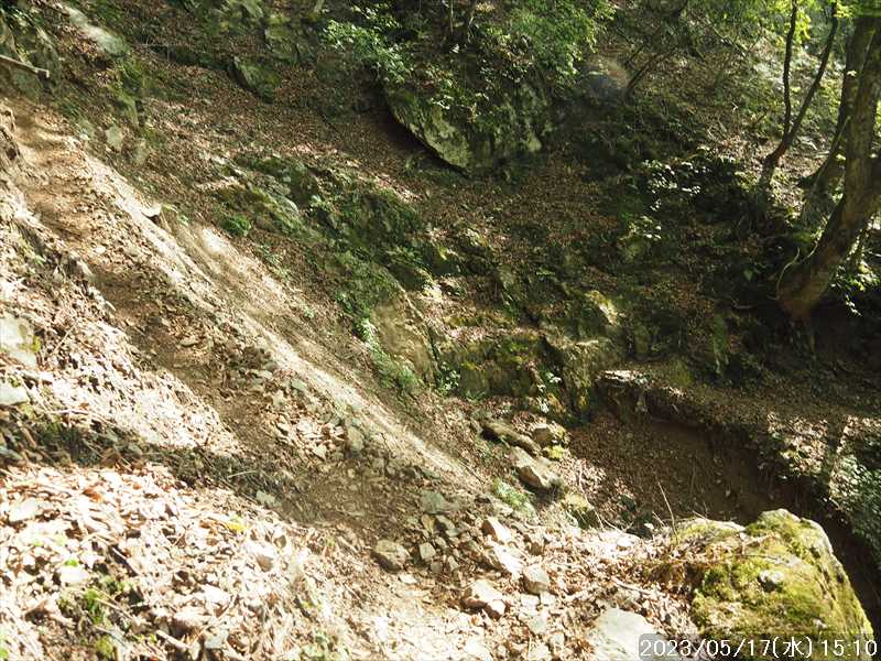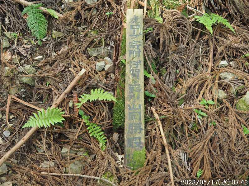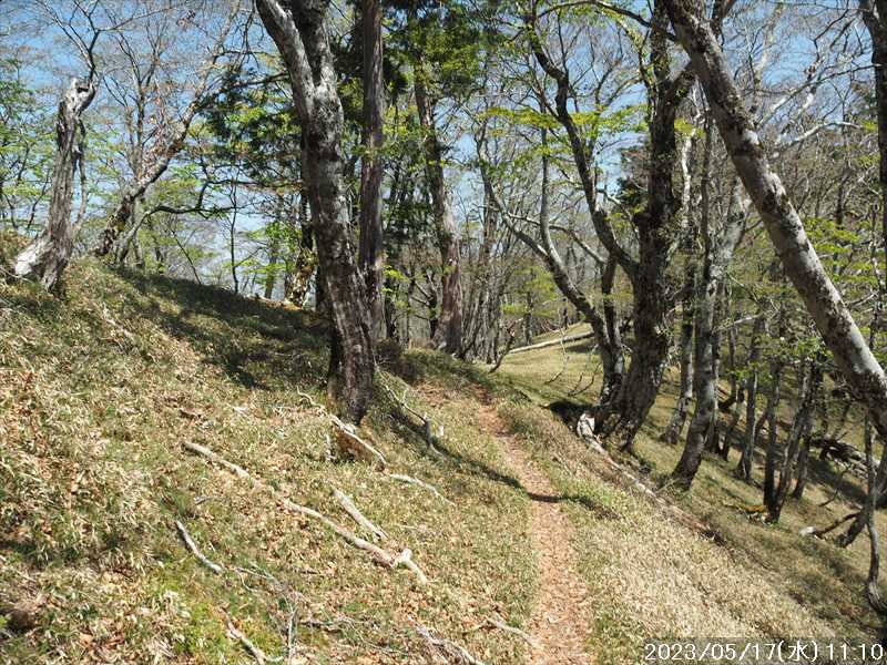 | 執以前にネットのレポで気になっていたルートから、山上ヶ岳経由で先週(5/9)も行った阿弥陀ヶ森への往復。 林道高原洞川線(毛又橋~五番関トンネル)の途中から、一本松茶屋の先で表参道に合流するルートだ。浅い谷筋の等高線が詰まっているのでルートが無ければとても歩けなさそうであるが、レポによると昔の杣道が残っている雰囲気でロープも設置されているとの事で距離は短い。 歩く予定の阿弥陀ヶ森まではロングルートになるので、頑張って早く起きて自宅をスタート。 早朝なので通勤渋滞には無縁で、順調に走り五番関トンネル手前 800mにある駐車地に到着 五番関に行くために何度も通ったことのある林道で、そこに駐車している車を何度か見かけた事をあるが、そこに登山口があるのは知らなかった。駐車していたのは登山者の車かは不明だが。 駐車地の前に側溝があるので、脱輪しないか確認して駐車。 準備する前に登山口を確認しに行く。橋を渡った所に登山口がある筈だがマークは何処にもない。明確な踏み跡もない。 1m程の岩の左右に山側に登れそうな所があった。雰囲気的には岩の右で川の横側。視察のため少し入ってみると先のほうに道が繋がっていた。 車に戻り行動準備。 到着時の外気温は 11℃だが、今日は急激に暑くなるとの予報。各地で真夏日となり群馬県では猛暑日との予測も。しかし今は若干肌寒いので薄い上着を着てスタート。 先ほど確認した登山口から入山。 林道から少し入ると踏み跡がハッキリとして来た、分かりにくいのは入り口付近だけだ。 川横を離れる所から急な登りに変わる。その登り部分にはロープが設置されていた。しかも山道(杣道)の両側にロープが張ってあった。何時頃設置されたロープか分からないが、植林の木に巻きつけられた部分が、木が成長してロープが食い込んでしまっていた。 登りなのでロープは必要ないが、ロープのおかげでルートは間違いようがない。荒れてはいるがルート自体もハッキリと分かる。ただし傾斜はキツイ、激登りだ。ほとんど朽ちているが丸太階段の残滓が各所に見られた。 頑張って登っていると湿気も多いようで汗が噴き出してきた。 一本松茶屋の先の参道に出合うまで 20分ほど、標高差 120m程の激登りだった。 参道に合流すると、そこからは緩い傾斜のダラダラ登り。しかし先ほどの激登りで足に疲れが出たのか一歩一歩が重い。 汗が吹き出ていて服が濡れてきているので脱ぎたかったが、洞辻茶屋で一息入れようとそのまま頑張る。 スタートして 1:11’で洞辻茶屋に到着。 歩き始めてそれほど経っていないのにかなり疲れた。何年か前(2015/7/12)に五番関から山上ヶ岳に向かう途中で暑さのためヘトヘトになり、この洞辻茶屋にヨタヨタで到着したことを思い出す。その再現だ。 先日NETで購入したばかりの薄い上着を脱ぐと、下のシャツはビッショリ。パンで小腹を満たしているとビッショリのシャツが冷たくなってきた。 山頂までコースタイムで 1:00’なので、時間は十分。慌てず体力と足に合わせ適当に進む。 洞辻茶屋から 8分ほどの小さな茶屋(陀羅尼助茶屋・松清店)を続けて 2つ抜けると山頂への分岐。いつも通り往路は左の鐘掛岩経由方面へ折れる。 途中の鐘掛岩の展望台と西の覗は、先を急ぐことにして往路ではパスした。帰路に寄れたらと寄ろうと思ったが結局帰路にも寄らなかった。 山上ヶ岳は一等三角点だけに寄り、疲れてはいたが何度か歩いたルートなので予定通り阿弥陀ヶ森を目指す。 山頂からは下りなのですんなりと歩くが、帰りの登り返しが嫌だなと頭にちらつく。 鞍部の小笹ノ宿を通過して、反対側に登り返しに入ると急に足が重くなった。が それほどの急坂でもなく、雰囲気も良い場所なのでそれなりに進み 8日ぶりの阿弥陀ヶ森の女人結界門に到着。 その 8日前は結界門の所から阿弥陀ヶ森のピークに登ったので、今回は柏木道を伯母谷覗方面へ進み阿弥陀ヶ森の東側からピークを目指す。 先週は緩い傾斜を楽々と下った場面だが、その傾斜の緩い登りがキツク感じて阿弥陀ヶ森のピークに上がる。一応ピークを踏んだのみで反対側へ引き返しにかかり、往路では登らなかった竜ヶ岳に向かう。 竜ヶ岳へは、横を通過していく奥駈道の近接点付近から適当に山頂を目指す。 倒木を避けながら登って行くとピーク手前に大岩が出てきた。右から巻いていると何となく踏み跡らしき道筋が出てきた。 それをたどり大岩の反対側に上がるとその付近がピークに見えた。山頂表示はないかと見回すも見当たらず。少し先も似たような高さなのでそこに移動するもそこにも山頂表示はない。 地形図の・1725の(・点)付近にも見当たらず。反対側から見ればあるかと思い先ほどのピークに戻るもやはり無い。致し方ないのでピークの写真だけ撮って小笹ノ宿目指して下って行く。 しかし倒木が多く、大きく迂回すると変な方向に下ってしまうかもしれないので、登ってきた方向に少し戻ってから下ると奥