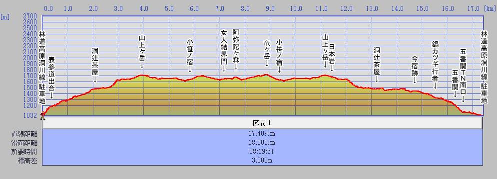 | 14:02~14:13 | 0:11 | ⑧ 洞辻茶屋 | ASC(総上昇)プロトレック | 1030 m | ||||||