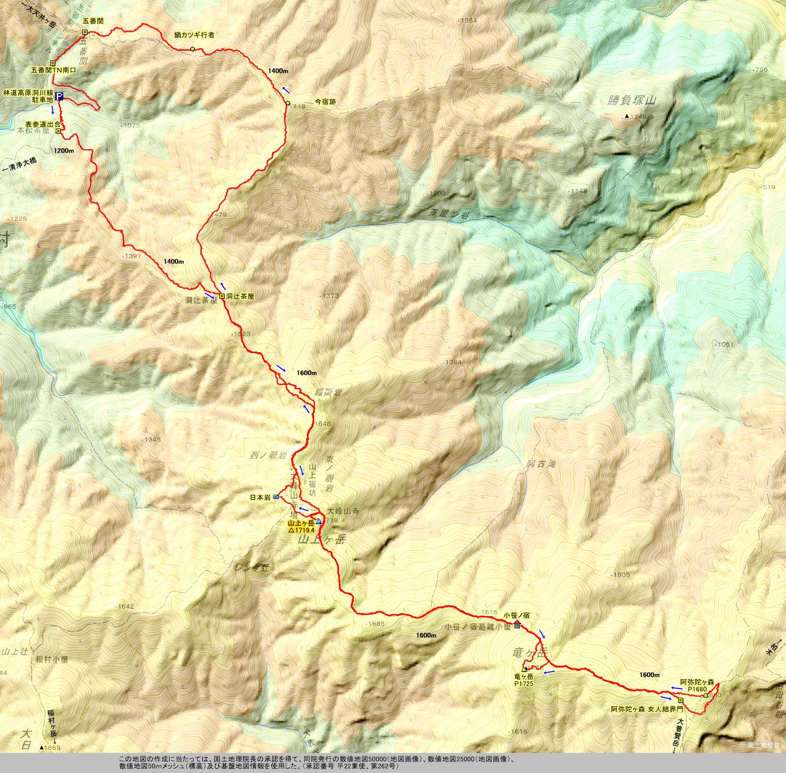 | P → 表参道出合(一本松茶屋 東側) → 洞辻茶屋 → 山上ヶ岳 → 小笹ノ宿 → 阿弥陀ヶ森 女人結界門 → 阿弥陀ヶ森 → 竜ヶ岳 → 小笹ノ宿 → 山上ヶ岳 → 日本岩 → 洞辻茶屋 → 五番関 → P |