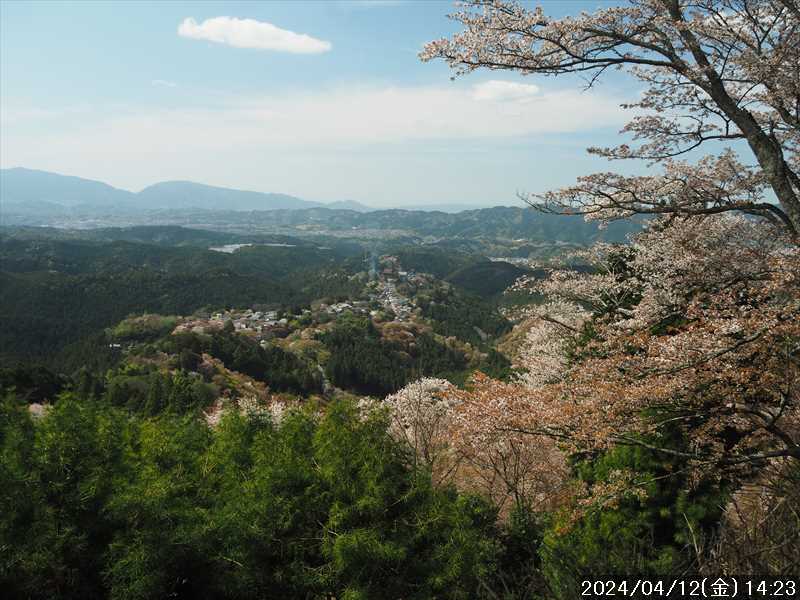 | 吉野にサクラ見物だ 新聞の「桜だより(8日現在)」では、吉野山・下・中・上とも満開となっていた。しかしその翌日・翌々日と荒天となり、満開となった花が多く吹き飛ばされた模様だ。 というわけで、サクラ見物にはならないかも 本来なら、満開だった数日前に行くべきだったが、腰をいわしてしまったのでその腰が落ち着くまで待っていたら最盛期を過ぎてしまった 腰をいわした原因は今月の4日にディーラーで冬用タイヤから夏用タイヤに変更してもらった後、タイヤを車から降ろし台車に乗せて小さな段差を超えるときに、かがんで台車を持ち上げた際に中途半端な姿勢で腰に力を入れたためだ。それぐらいのことで以前は何ともなかったが、老化現象であちこちが痛んでる。 普通の姿勢で過ごしている分には何ともないが、前屈姿勢をとったり何かを持ち上げようとすると痛みが走る。それもようやく落ち着いたので、遅れ馳せではあるが、散らずに頑張っている木や、奥千本のサクラを期待して行くことにする 観桜期も終盤を迎えた平日でもあるので、喜佐谷の駐車場も満車にはならないだろうと思われるので、5年前に歩いた同じ場所からのスタート地に選んだ いつも通りに起きて自宅をスタート。 平日なので走っている車は多かったが渋滞するほどではなかった。ただ信号には多く引っかかった。 いつもは、途中のコンビニで昼食を仕入れるが、このところのコンビニは値上げが激しく、前回いつも通りの食材を購入したのに余りにも高くなっていたのにビックリした そんなことがあったので、事前に経路途中にある24hスーパーを確認しておいて、今回はそこで食材を調達した。 値段が違うことにビックリ。同じ具材のオニギリがコンビニでは¥185だったものが、24hスーパーでは¥80 で半額以下だった。パンも 2~3割は安かった感じ。グルメ家ではない当方には味は変わらない。 スマホ決済やカードが使えないので不便だが、安さには致し方ない 渋滞には合わなかったが案外に時間がかかり現地に到着、グーグルマップに「吉野ハルカノ谷駐車場」とある駐車場だ。先着車は 5台、意外に多かった 到着時の外気温は 12℃、案外に低いが天気が良いので放射冷却のせいと思われる。日が昇るにつれ暑くなってくると思われる 駐車場の横を通っている道から目的地を目指す、吉野の観光マップには「吉野・宮滝万葉の道」とあり近畿自然歩道でもある。遊歩道のような道をダラダラと登って行く スタートして 40分強で、御園からの道と合流して、その少し先が如意輪寺への分岐。その如意輪寺方面に折れる。今回も蔵王堂方面に先に行く予定にしている。 分岐から大きく谷を巻いて行った先が稚児松地蔵のある分岐で石標の「右 如意輪寺」の山道に進む。 少し行くと下りに変わり、ルートが荒れている。今日は靴底の減った昔の軽量靴を久しぶりに履いて来たら、濡れた岩場部分で滑って尻餅、ヤバいと思い気を付けて歩いたのにマタマタ尻餅。家に帰ったらズボンが泥で汚れていた。その先も滑らないようにメチャ慎重に下った。 そんな荒れた山道から着地したところが如意輪寺の駐車場。係員がいて車を誘導していた、バスも停まっていた。 駐車場の看板には駐車料金¥2000とあった。観桜期の特別料金だがそれにしても高い。一番奥のトイレのある駐車場まで行って裏山門から如意輪寺の境内に入る。 本堂裏側にあるの後醍醐天皇塔尾陵は前回訪問しているのでパスして、本堂前の山門から境内を抜けて下って行くと谷横に舗装道路のある分岐。5年前は谷の反対側に登り返して行ったが、今回は舗装道路を吉野駅・吉野温泉元湯方面に向かう 舗装車道を 8分ほどで吉野温泉元湯に到着し、道標に従い吉水神社への道に折れる。 急斜面をジグザグに登って行く道だが、それでもキツイ登り。人ひとり分の細い道で舗装されている。地理院の地図には載っていないルートだ。 キツイ登りを10分ほどで、商店街から吉水神社への道に合流した。 吉水神社の門から境内に入ると、「一目千本」の看板のある中千本の大展望地。そこからは中千本が文字通り一目千本。遠目で見る限りではほぼ満開のように見えた。ここに来たのは初めてだったので少し感動。 素晴らしい景色を見せていただいたので本殿に参拝に行くと、先に参拝していた人か柏手を何度もたたいていた、二拍を知らないのかなと思っていたら、参拝の作法の看板があり「二礼 十七拍 一拝」とあった。当方もその作法に従いお参りした。 吉水神社から金峯山寺に移動して国宝の蔵王堂を見て、もう一つの国宝の仁王門を見ようとしたらまだ素屋根がかかっていて修理中だった。 そこで引き返し奥千本に向かう途中で大名行列のイベントに遭遇。平日なのにやたら人が多いなと感じていたがそんなイベントがあった為みたい。通過するまで 10分ほど見学して先に進む 商店街を抜けた後の登りがキツイ事、ヒーコラ言いながら登る。途中の三角点のある火之見