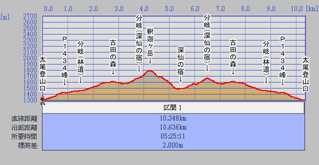 | 1300m | 08:37 | ① 太尾登山口 | 0:25 | 0:31 | 0:25 | 出発時間 | 05:50 | 14:15 | ||