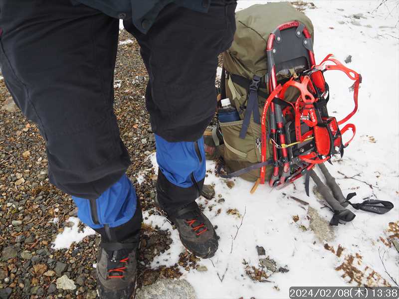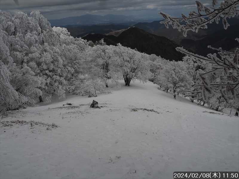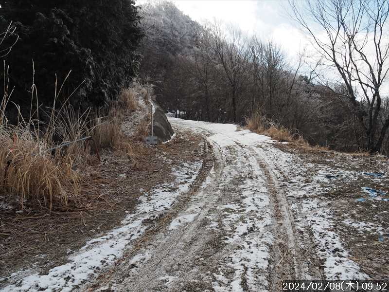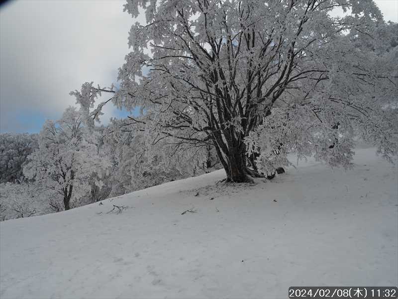 | 1月下旬に名神の関ヶ原で立往生のあった時以来、積雪の音沙汰がない。 中でも雪がまだ残っていそうな蛇谷ヶ峰に行こうとしたら日本海側の天気はイマイチ。太平洋側は、お日様マークが並んでいた。 ということで行先を南部に変更した。 雪は少ないと思われるが、上の方にはそれなりにまだ残っている事を期待して、毎年のように訪れている天女の舞に行くことにした。 歩くルートが長いので、頑張って少し早く起きて自宅をスタート。 家を出ると外はまだ真っ暗。風はないが寒くて、手がメチャ冷たく感じる。車で走り出すと外気温は 0℃だった。 平日だが通勤時間帯前なのですんなり走れ、下市からの登りでダンプに何度か引っ掛かり、その部分で少し時間がかかって駐車地の天川村役場に到着。 道路はすべてドライで、道路わきに雪のかけらもなく、現地が近づいても回りの山々にはは白いものは全く見当たらなかった。 役所の始業前なので駐車場はガラガラだった。準備中に何台か到着してきたが山行きの人はいなかった。 見える範囲に白いものは一切なかったが、上部には雪が残っていることを期待してスノーシューを担いでスタート。現地到着時の外気温は 0℃だった。 近道のグランドは登山靴での侵入は禁止なので、役所の入り口からグランドを回り込んで登山口に向かう。 回り込んだ先の、登山口から入山。 登山口から少し入ると傾斜が出てきて、段差のあるエキスパンドメタルの蛇篭階段が始まる。 重い荷物を背負っているのでその階段を上がるのが厳しい。歩き始めという事もありヒーコラ言いながら一歩づつ頑張る。 登山口から 15分ほど頑張ると尾根に上がり蛇篭階段にお別れできたが、その先の尾根登りも傾斜があるのでまだまだ厳しい登りが続いた。残雪は全くないので滑らないが、登山道がえぐれ木の根が多くあるので歩きにくい。 傾斜のある尾根登りを十数分頑張ると傾斜が緩み、標高 820m付近にある鉄塔台地(下側)に到着。 天気予報通り上天気で展望が開けていた。正面の観音峰山に白いものはなかったが、稲村ヶ岳の山頂方面は白かった。標高の高い所には霧氷が出来ているみたい。 写真を撮っただけで、そのまま引き続き上を目指す。残雪は全くなかったが標高 1000m近くまで高度を上げると、足元には小さな粒状の白いものが散らばっていた。残雪ではなく舞った雪が残っている感じ。 その先、高度を上げると登山上に踏み固められた雪が残っている部分が出てきた。傾斜がなければ問題ないが、傾斜のある部分は滑り始めた。とは言っても気を付ければ危険はないのでノーアイゼンのまま登って行く。 上側の鉄塔台地に上がると、下の鉄塔台地では全貌が見えていた稲村ヶ岳の上部にガスがかかっていた。天気が安定していない感じ。 小腹が減ってきたが、林道出合まであと少しなので小腹ごしらえは林道の展望地ですることにしてその鉄塔台地はそのまま通過。薄いが残雪がある所に今日のトレースが数人分ある感じ。先行者がいる模様だ。 スタートして 1:42’で林道に到着。林道上には轍がありカーブの先にジムニーが停まっていた。坪ノ内林道が通れるようになったらしい。ココまで車で来られたら、八経ヶ岳への周回は楽になる。 林道の展望地に行くと、前方の樹々が成長してきて展望範囲が狭まっていた。 そんな景色を見ながら小腹にパンを入れ一服。 その先、林道上は雪が薄く、林道の半分くらいは土が露出しているほどだったので、往路は山道から向かうことにして、左の山道に入る。 少し上がった所で山道上の踏み固められた雪で滑って登れなくなったので持ってきた 4本爪のアイゼンを履いた。人は通らないが傾斜のある狭い所だったので履きにくかった。 4本爪でも足の裏全体で踏んでおれば問題ないが、後ろ足をつま先から蹴り上げると中央の爪部分が浮いてしまって滑るので、登りでは小股で浮かさないように歩く。 小ピークに上がる手前で霧氷が出てきた。青空でないので少し映えない所もあるが雰囲気は良い。 小ピークをトラバースして行く所は、滑り落ちないように慎重に通過して進む。右側から巻いてきている林道と接近して、その先は尾根上のルート。進むほどに霧氷は厚くなり見映えが増してくる。 小さなアップダウンを 2コほど越して、危険のないトラバース道を超すと栃尾辻の小屋に到着。スタートして 3:02’かかった。 目的地まであと少しだが、そこからは登りがキツくなるので、小屋の横で 12本爪に履き替える。雪は薄いが固められ凍っているので 4本爪では歯が立たない所も出てきたためだ。 履き替えた後は足が重くなり慣れないので歩きにくいが、キツイ坂登も滑ることはなくなった。 一頑張りすると、傾斜が緩み広い場所に出た。天女の舞に到着だ。そこには帰り支度をしていた夫婦さんがいたのみ。 雪は薄いが、回りの樹々には霧氷がタップリと着いていた。景色も広がっているので稲村ヶ岳・大日山がクッキリと見えては